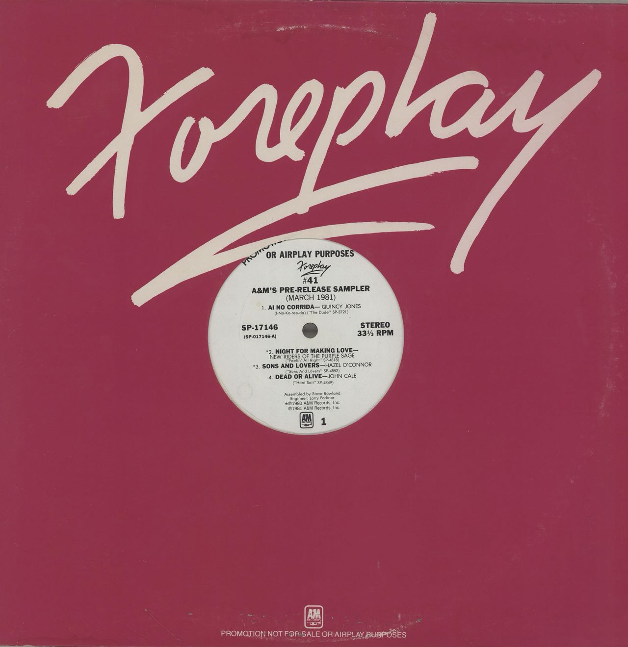 A&M RECORDS Foreplay #41 - A&M's Pre-Release Sampler (March 1981 US 9-track promotional only vinyl 12" sampler issued to radio station for airplay purposes, featuring material from key record label artists including Quincy Jones, John Cale, New Riders Of The Purple Sage, Hazel O'Connor and The Cramps. With custom printed labels and housed in an A&M 'Foreplay' pink and white die-cut card sleeve SP-17146)