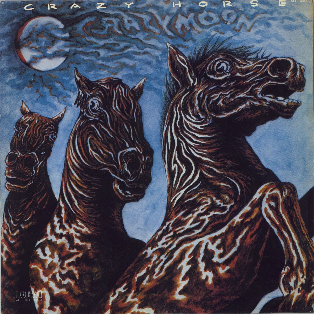 CRAZY HORSE Crazy Moon (1978 US 11-track LP by Neil Young's band & featuring Neil on guitar, complete with original lyric inner in a great artwork 'horses' picture sleeve. The sleeve shows light wear with the vinyldisplaying just a few light signs of play. An excellent copy! AFL1-3054)