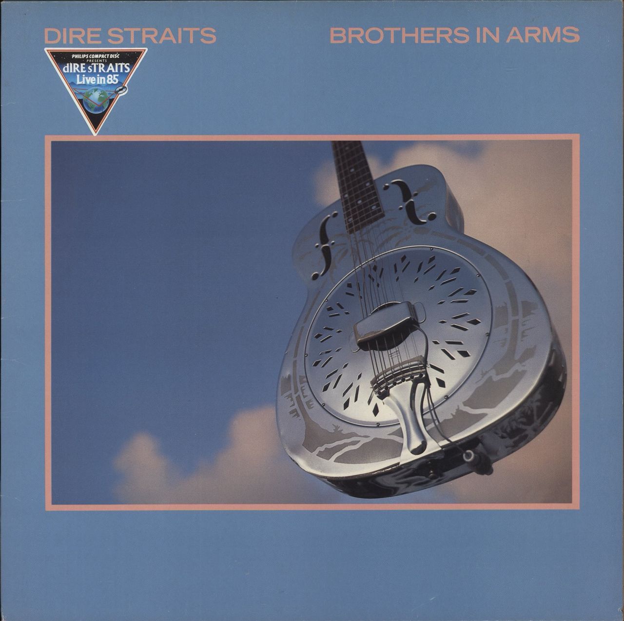 DIRE STRAITS Brothers In Arms (1985 first UK press 9-track LP with 'masterdisk RL', including the heart-wrenching title track, the iconic Walk Of Life & the famous 'MTV' rocker Money For Nothing guest starring Sting, picture sleeve with illustrated lyric inner. This copy has the incredibly rare 'Dire Straits Live in 85' hype sticker from Philips Compact Disc - with this album heralding the coming of the format! The sleeve shows just a little faint wear and the vinyl is Near Mint with no need to upgrade. A very rare variant and in a condition to die for! VERH25)