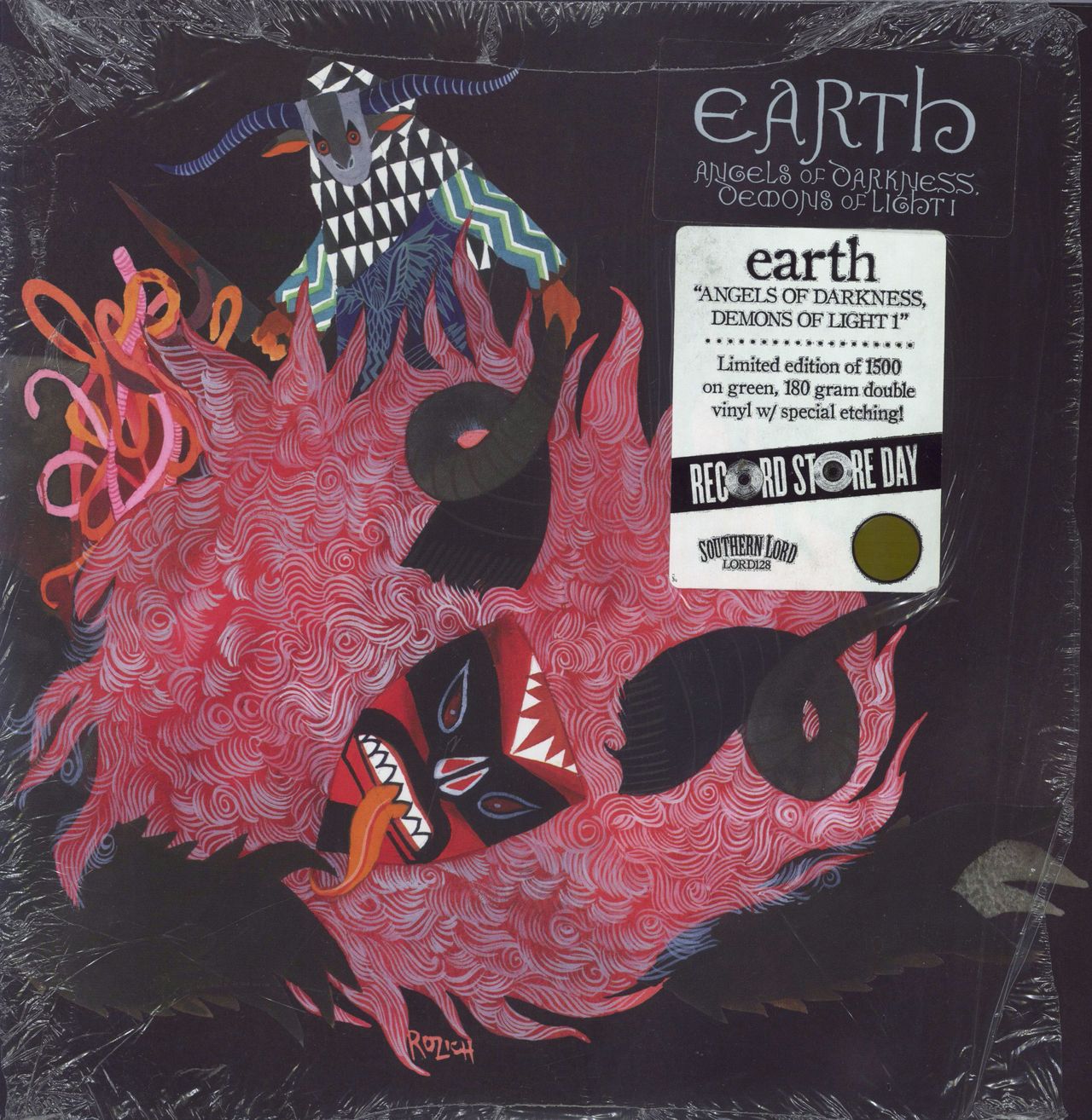 EARTH Angels Of Darkness, Demons Of Light I (Limited edition 2011 US 5-track double LP pressed on Green Swirl Vinyl with the 4th side beautifully etched, heavyweight pasted gatefold picture sleeve. Dylan Carlson's stoner rock doom merchants offer five long, melodic and riff-heavy pieces - guaranteed mind warpers one and all! The sleeve is in the hype-stickered and custom stickered open shrink; which has split at the corners, thusly revealing a little corner wear. The vinyl are both in Near Mint condition LORD128)***Limited to only 1500 copies***
