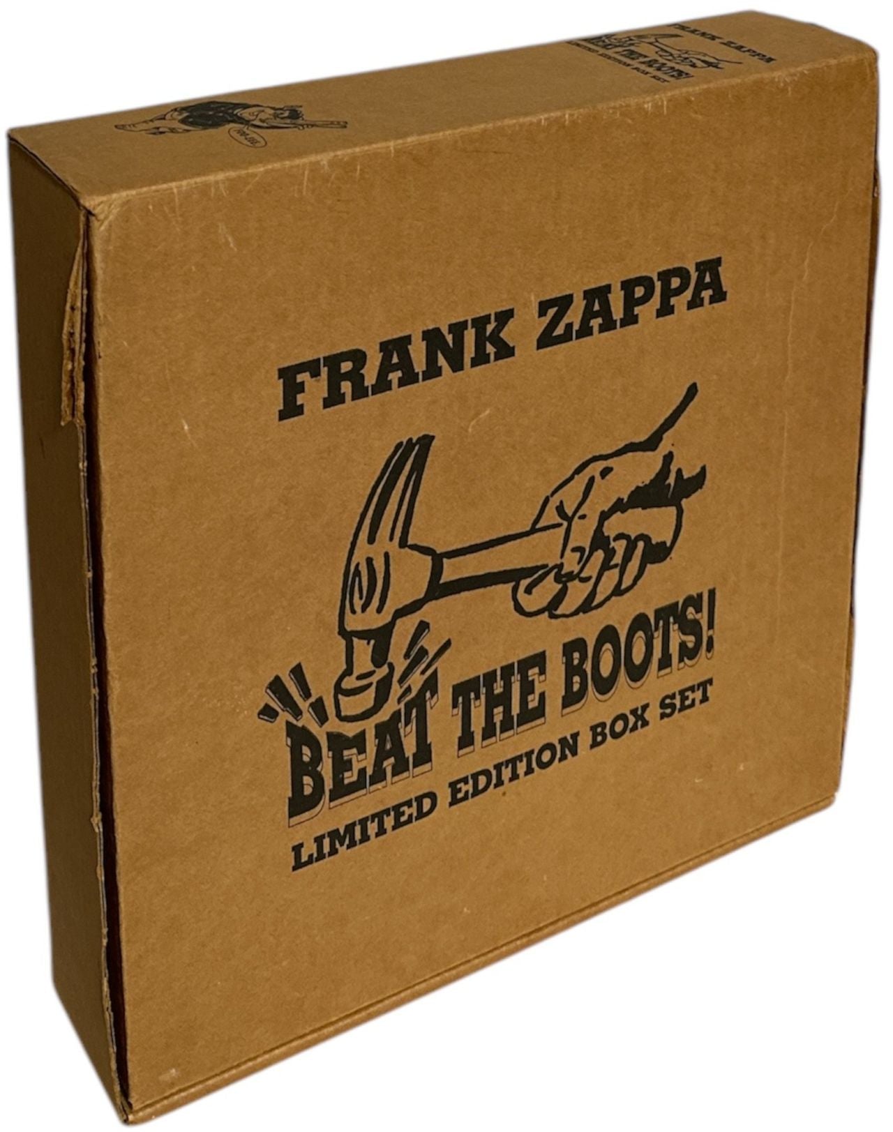 FRANK ZAPPA Beat The Boots (Scarce 1991 US limited edition Box Set comprising EIGHT Cassette Albums. A collection of bootleg recordings which were originally distributed illegally but were released officially as part of Zappa's campaignto dissuade his fans from buying illegal recordings of his concerts. The whole set is digitally remastered from the original sources & spans a fifteen-year period from September 30, 1967 ('Tis the Season to Be Jelly) to May 21, 1982 (two tracks from As an Am). Each cassette is housed in a cassette case with picture insert. Also includes a custom printed T-shirt [size - XL] and 2" diameter badge. All housed in a 12½" x 12½ custom printed brown card box which opens up to reveal a superb full colour stage pop-up. The box shows just a little light edgewear and the contents are near as new R-70907)