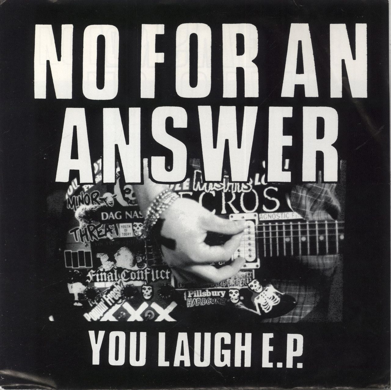 NO FOR AN ANSWER You Laugh EP (Rare 1988 US Second Pressing 6-track 7" vinyl EP, with picture sleeve and lyric/picture insert, and silver with black text centre labels, limited to 2000 copies. The debut EP from the Californian hardcore punk band, who only last for two years on their inital run but gave the scene some of its most important and influentiual music. The sleeve shows some very minor wear from storage, and the vinyl displays little evidence of play and remains in all round excellent condition. Essential)