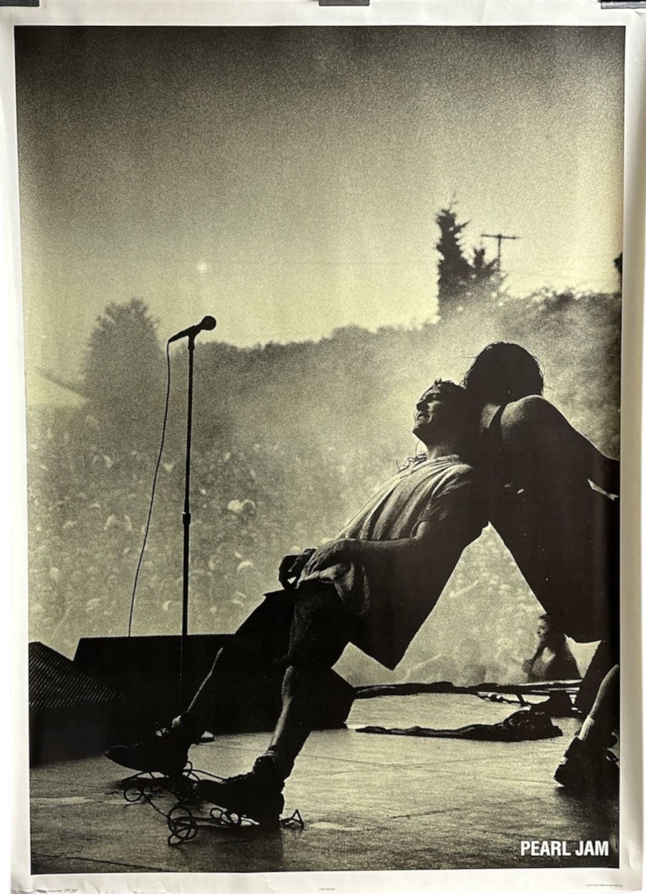 PEARL JAM Pearl Jam (Early 1990s UK 35" x 25" GB posters print of Kevin Westenberg's great iconic shot of Eddie on stage at Lollapalooza 1992. This superb example has just a little creasing to the edges, but no sign of having been previously displayed and stored rolled, making this a wonderful example for framing)