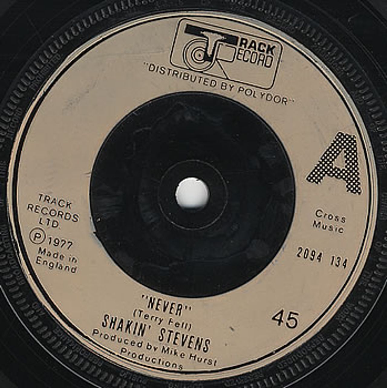 SHAKIN' STEVENS Never (1977 UK Track Record injection moulded 7" vinyl single, also including You Always Hurt The One You Love. Issued in a plain Track company die-cut paper sleeve, the vinyl appears in excellent condition)