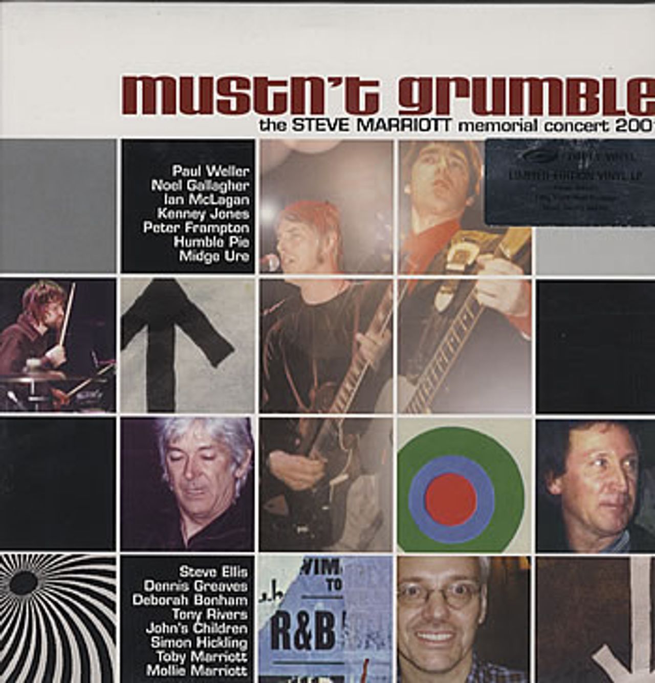 STEVE MARRIOTT Mustn't Grumble (2002 UK limited edition Simply Vinyl issue 2-LP set pressed on 180gram VIRGIN VINYL featuring 21 tracks recorded live on the 20th April 2001 to mark the 10th Anniversary of Marriott's tragic death, including performances by John's Children, Humble Pie, Paul Weller, Noel Gallagher and many more, presented in a gatefold picture sleeve housed in a sticker PVC dust jacket and remains sealed SVLP378)