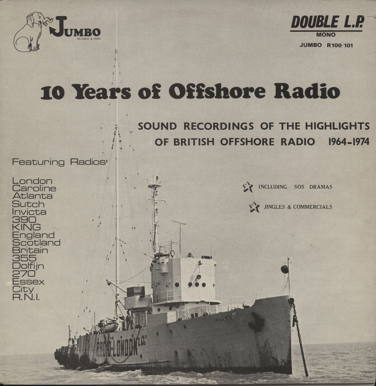 VARIOUS RADIO 10 Years Of Offshore Radio (Rare original 1974 UK double LP featuring airchecks from the Sixties offshore stations on record one. Record two features station jingles including the Radio London theme 'Big Lil' and extracts from RadioNorthsea International during 1970 to 1971. Of Particular interest is the excerpt from Radio Sutch - Screaming Lord Sutch's radio station & the inclusions of the final closedown broadcasts & even SOS signals! The album was reissued in revisedf orm to remove all copyright reserved material, the later issues carry a small sticker on the cover to this effect - This is the original version R100/101)