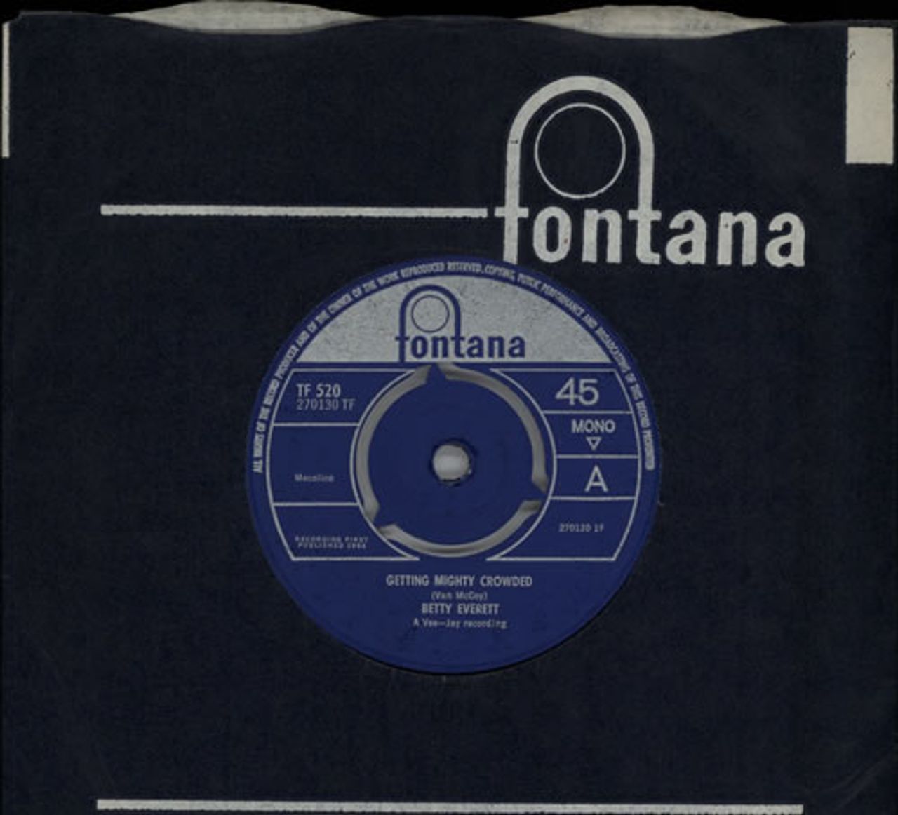 BETTY EVERETT Getting Mighty Crowded (1965 UK 7" mono single with intact original three prong centre, also featuring Chained To A Memory, Fontana company die cut paper sleeve with penned title annotations. The vinyl reveals just a few light scuffs but is otherwise clean and in excellent condition TF520)