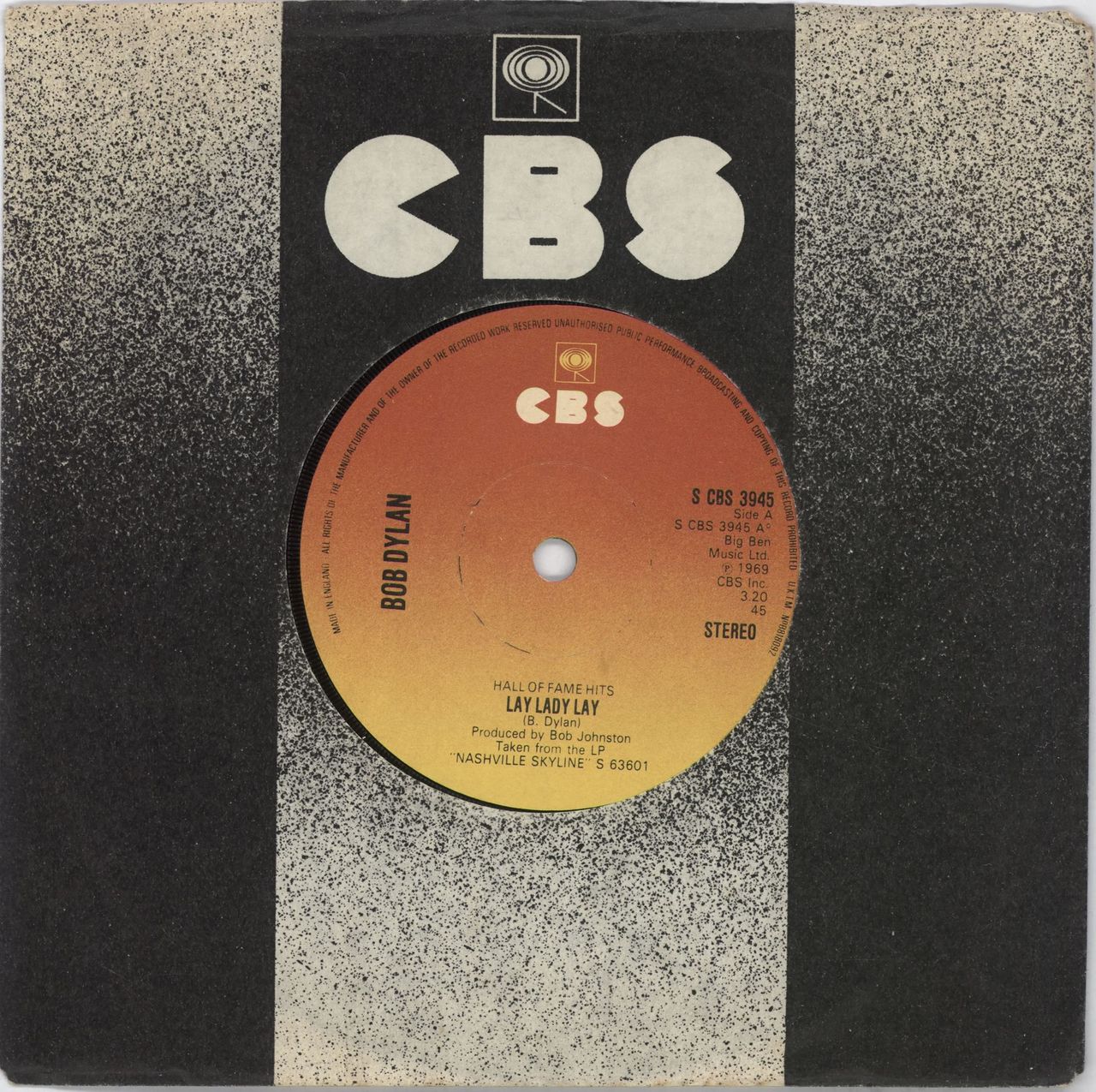 BOB DYLAN Lay Lady Lay (1976 UK Hall Of Fame series solid centre issue of his 1969 7" vinyl single, also including I Threw It All Away. The vinyl appears in excellent condition with light signs of play and comes issued in a CBS company die-cut paper sleeve SCBS3945)