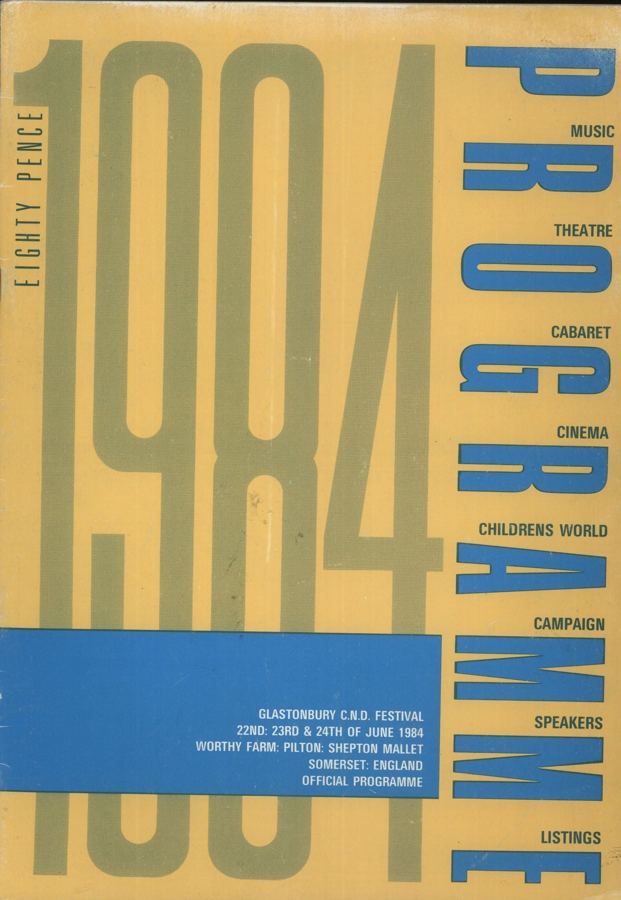 GLASTONBURY 1984 Festival (Official UK 36-page programme for the three day CND Festival from 22nd-24th June 1983, features venue details, interviews and biographies of the artists on the bill. Featuring The Waterboys, The Smiths, Elvis Costello, Joan Baez and Ian Drury and many more. The cover displays some light general wear otherwise remains in a really nice condition)
