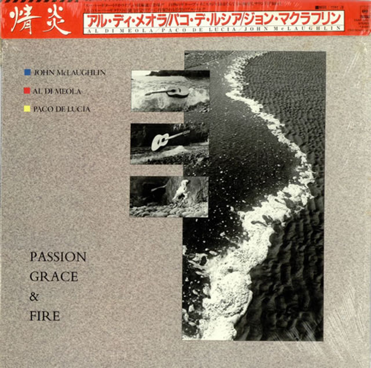 JOHN McLAUGHLIN, AL DI MEOLA & PACO DE LUCIA Passion, Grace & Fire (1983 Japanese 6-track vinyl LP, their second set of acoustic guitar trio recordings after Friday Night in San Francisco, with each guitar panned left, right and centre, making for an impressive, technically perfect set of modern compositions in a flamenco-jazz style. Picture sleeve and Japanese insert, still wrapped in its open shrink with top obi-strip 25AP2651)