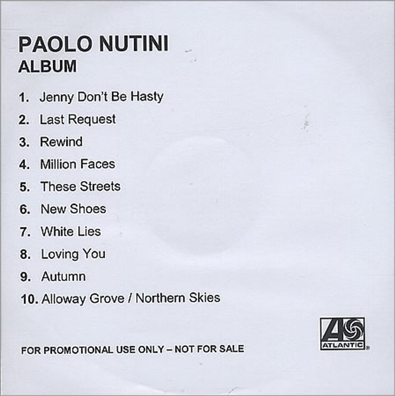 PAOLO NUTINI These Streets (2006 UK 10-track advance Atlantic label CD-R acetate album, issued exclusively to radio stations and reviewers. This is the debut album from the 19-year-old singer/songwriter from Paisley, Scotland, whose songs suggesthe knows an awful lot about the vicissitudes of life and love, and demonstrate his unique gift for expressing in song the attitudes and experiences of someone his age; and include the singles 'These Streets' & 'Last Request'.Custom printed disc plus title/tracklisting inlay)