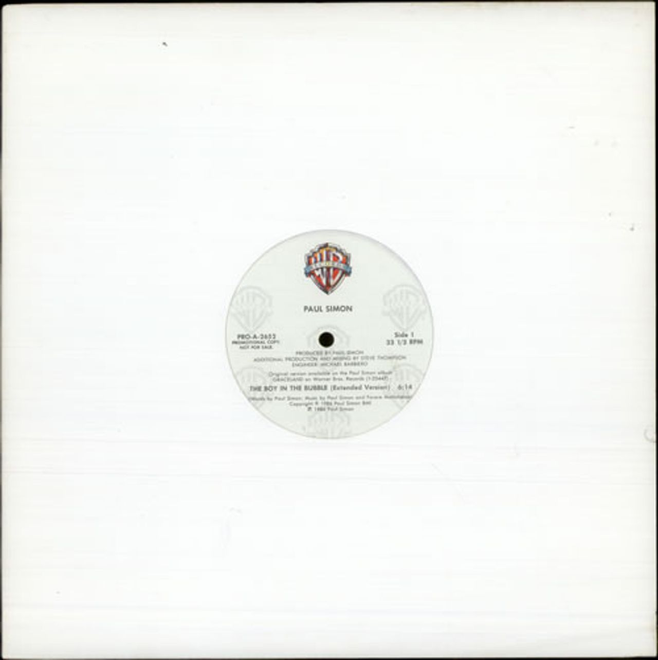 PAUL SIMON The Boy In The Bubble (1986 US promotional vinyl 12" featuring the 6:14 Extended Version and 3:59 LP Version of the title track, plain die cut sleeve PRO-A-2652)