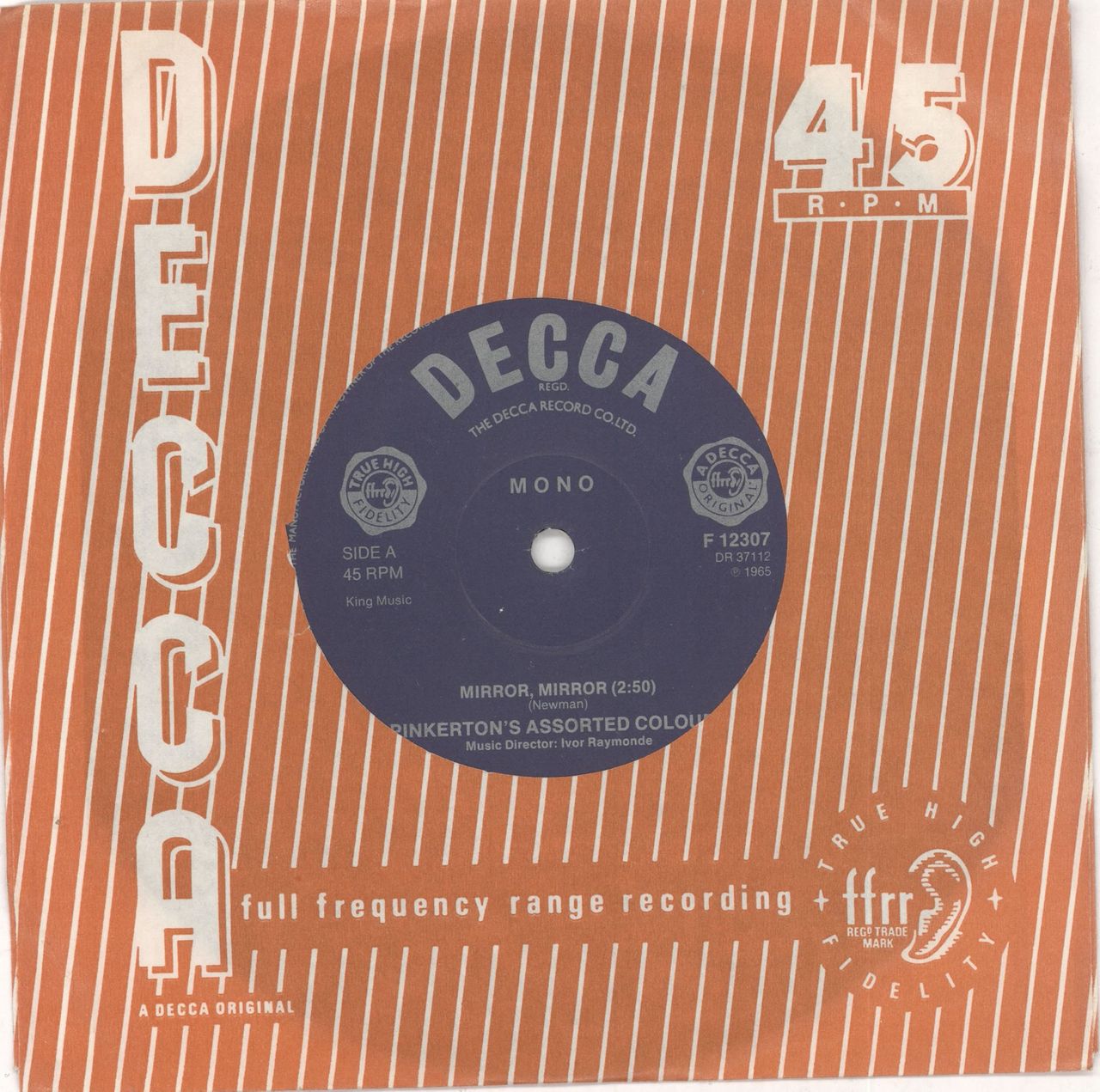 PINKERTON'S ASSORTED COLOURS Mirror, Mirror (1982 German solid centre issue of the 1965 7" vinyl single, also including She Don't Care, Decca company die cut paper sleeve F12307)