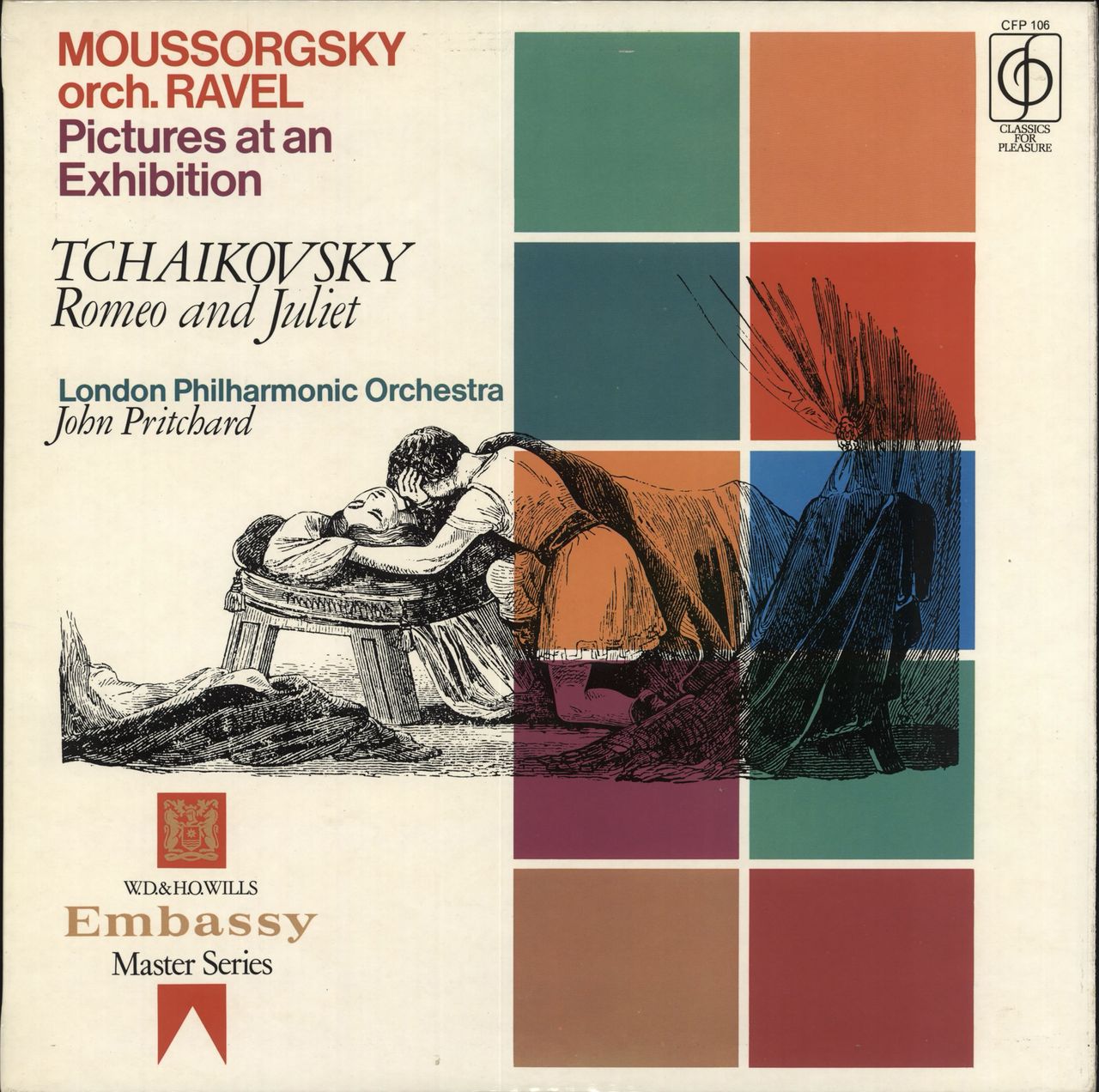 LONDON PHILHARMONIC ORCHESTRA conducted by JOHN PRITCHARD Mussorgsky: Pictures At An Exhibition / Tchaikovsky: Romeo And Juliet (1970 UK Stereo LP featuring Ravel's classic transcription of the Mussorgsky piece, which also includes a performance of the Fantasy Overture from Romeo & Juliet by Tchaikovsky, front laminated picture sleeve. The sleeve shows just a little light shelfwear & the vinyl carries some mild signs of play CFP106)