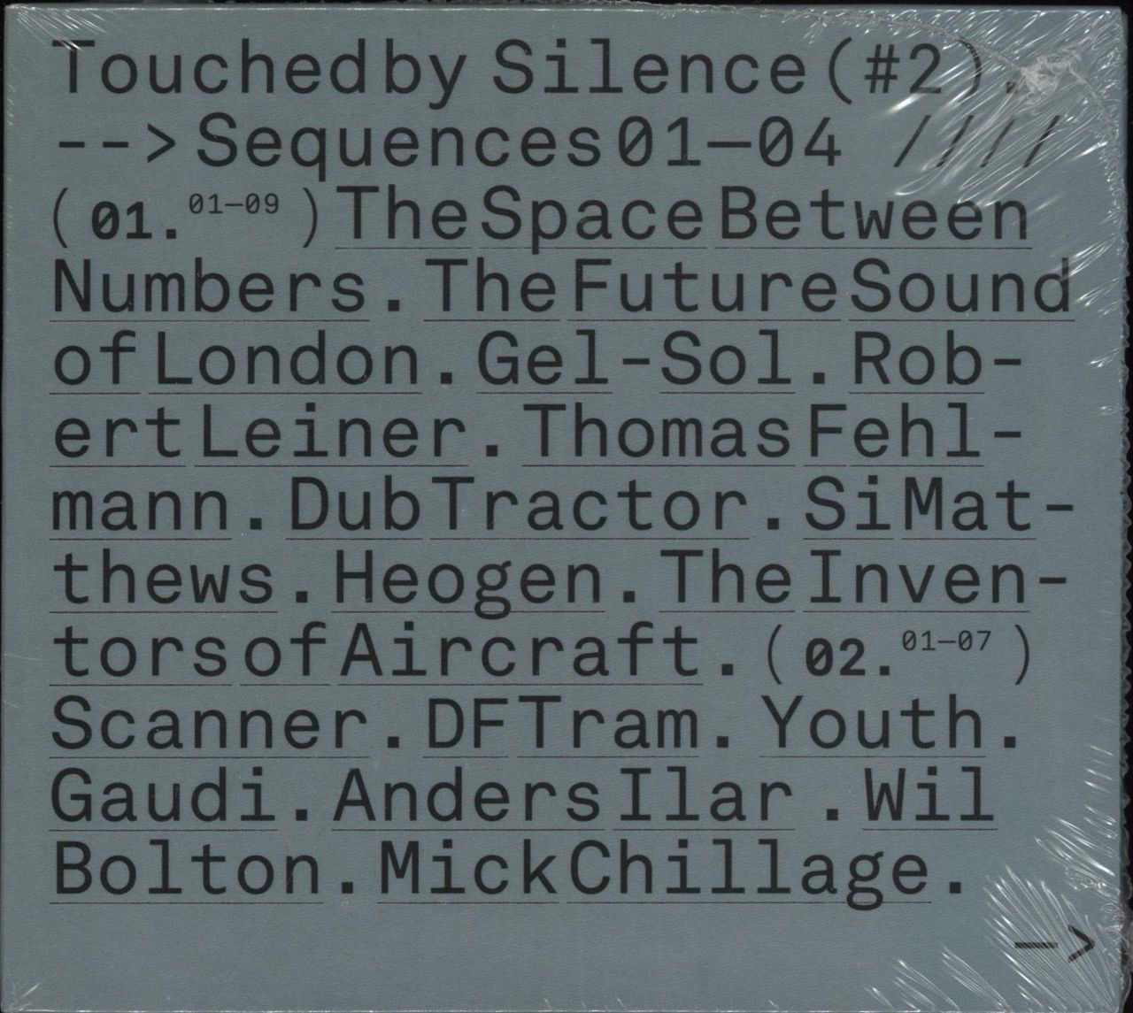 VARIOUS Touched By Silence (#2). -->Sequences 01-04 //// (Sealed 2023 UK/EU 35-track FOUR CD set, featuring tracks by The Future Sound Of London, Thomas Fehlmann, Scanner, Youth, Gaudi & more. Each disc is housed in its respective card walletsleeve, all kept in an outer title sleeve. Sealed from new TMX7)