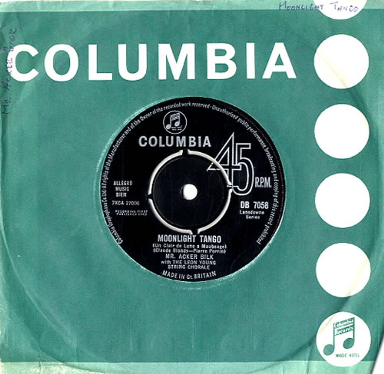 ACKER BILK Moonlight Tango (1963 UK 7" vinyl single with intact original four prong centre, also featuring Bitter Harvest, Columbia company die cut paper sleeve DB7058)
