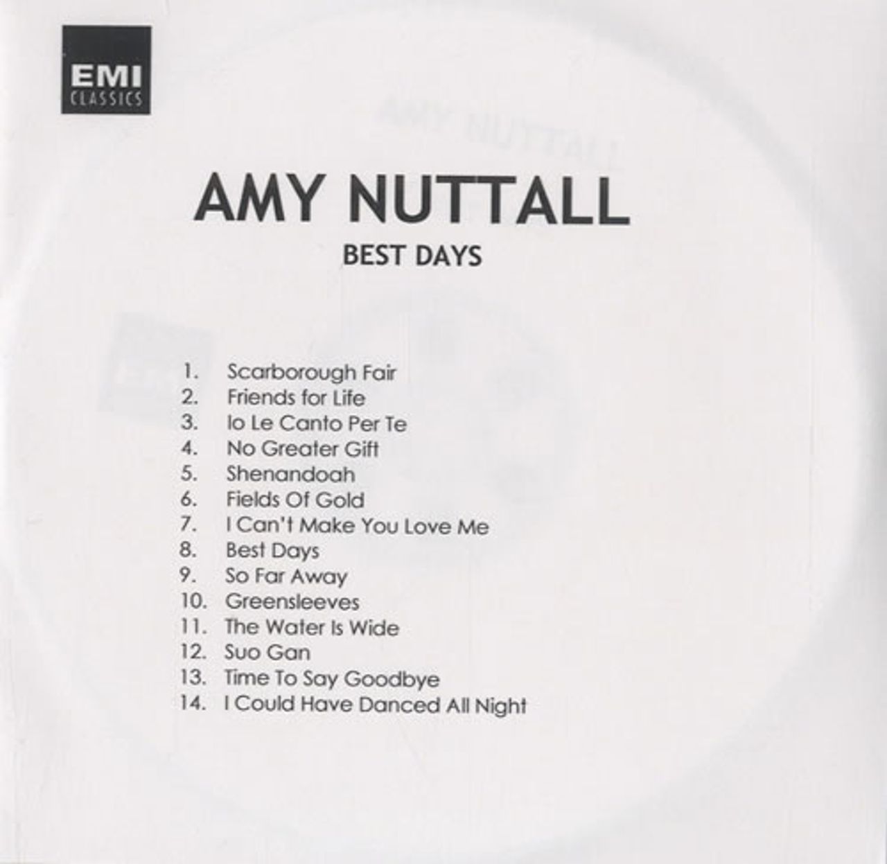AMY NUTTALL Best Days (Official 2005 UK EMI 14-track promotional CD-R acetate of the debut album by the British actress and singer most notable for playing the role of Chloe Atkinson in the long-running ITV soap opera Emmerdale from 2000 to 2005.Features No Greater Gift, Scarborough Fair and the title track single. Custom printed disc + title/tracklisting insert)