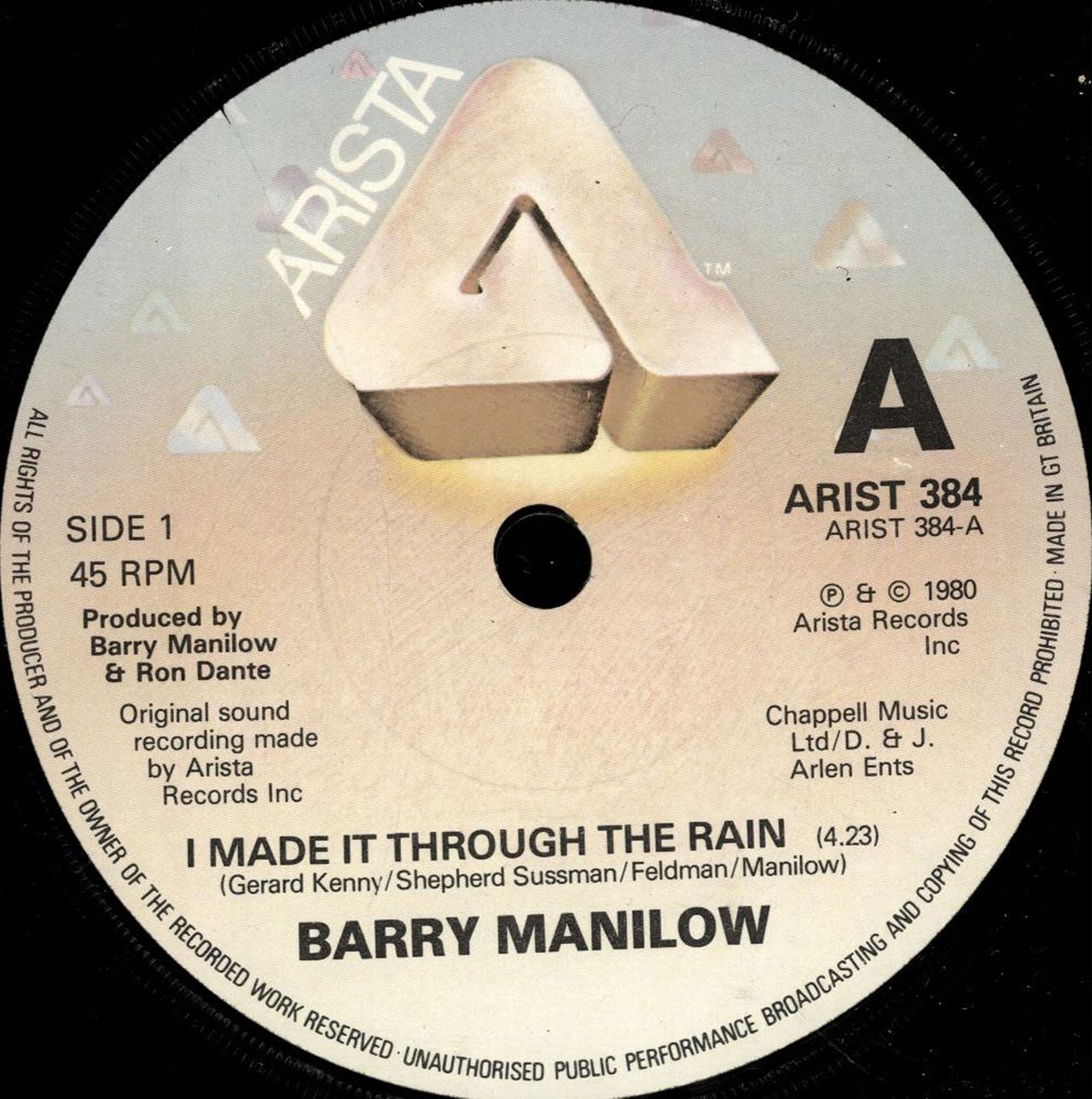 BARRY MANILOW I Made It Through The Rain (1980 UK 7" vinyl single with solid centre, also including Only In Chicago, plain die-cut paper sleeve ARIST384)