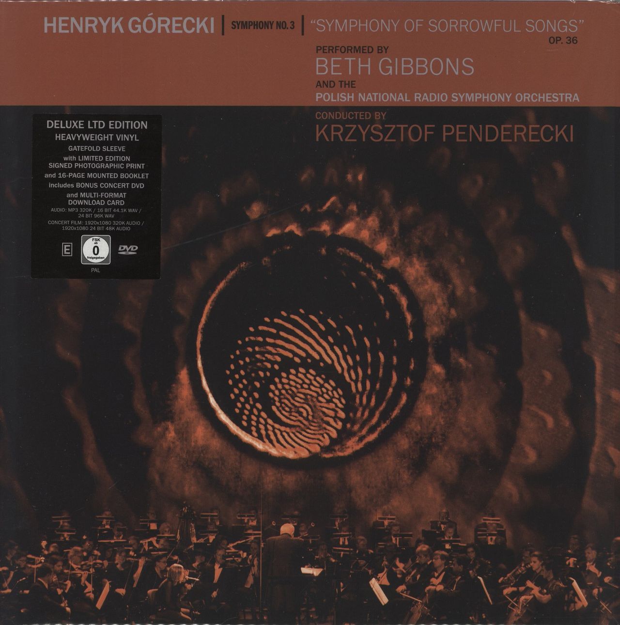 BETH GIBBONS Symphony No. 3 [Symphony Of Sorrowful Songs] Op. 36 (Limited Edition 2019 UK/EU 3-track LP pressed on Heavyweight Vinyl, which saw the Portishead vocalist perform Henryk Gorecki's 'Symphony No.3' accompanied by the Polish NationalRadio Symphony Orchestra at the National Opera Grand Theatre in Warsaw on 29th November 2014, conducted by the great Krzysztof Penderecki [RIP]. Housed in a deluxe gatefold picture sleeve with integral picture/ lyric booklet, expired download card & bonus DVD of the concert [region 0] with resealable poly outer bag with hype-sticker. This copy includes an Autographed high quality photo print, signed by Beth clearly in silver pen. The sleeve shows just a little light wear to the top right corner but is other wear free of shelfwear. The vinyl is Near Mint WIGLP395X)