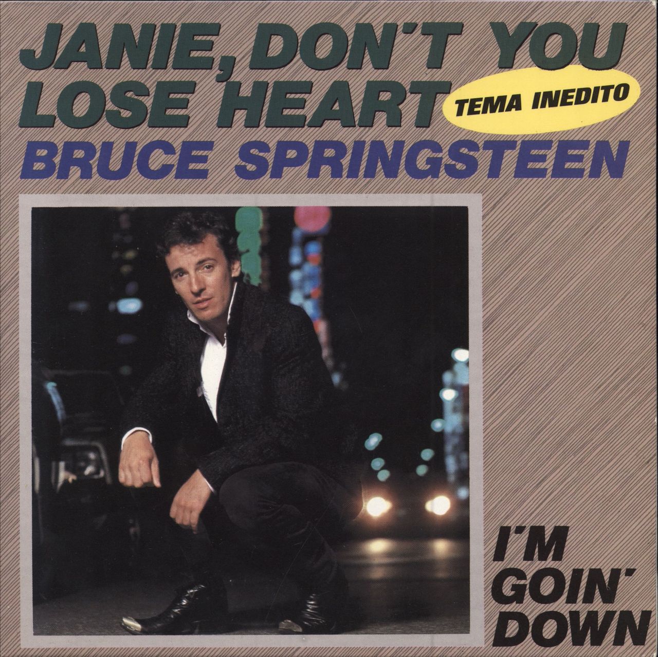 BRUCE SPRINGSTEEN Janie, Don't You Lose Heart (1985 Spanish wide centred 7" vinyl single, also including I'm Goin' Down. The vinyl comes issued in the unique gatefold picture sleeve with lyrics to both tracks in both English & Spanish and tourdates with discography on the back plus the Clarence Clemens insert! CBSA6561)