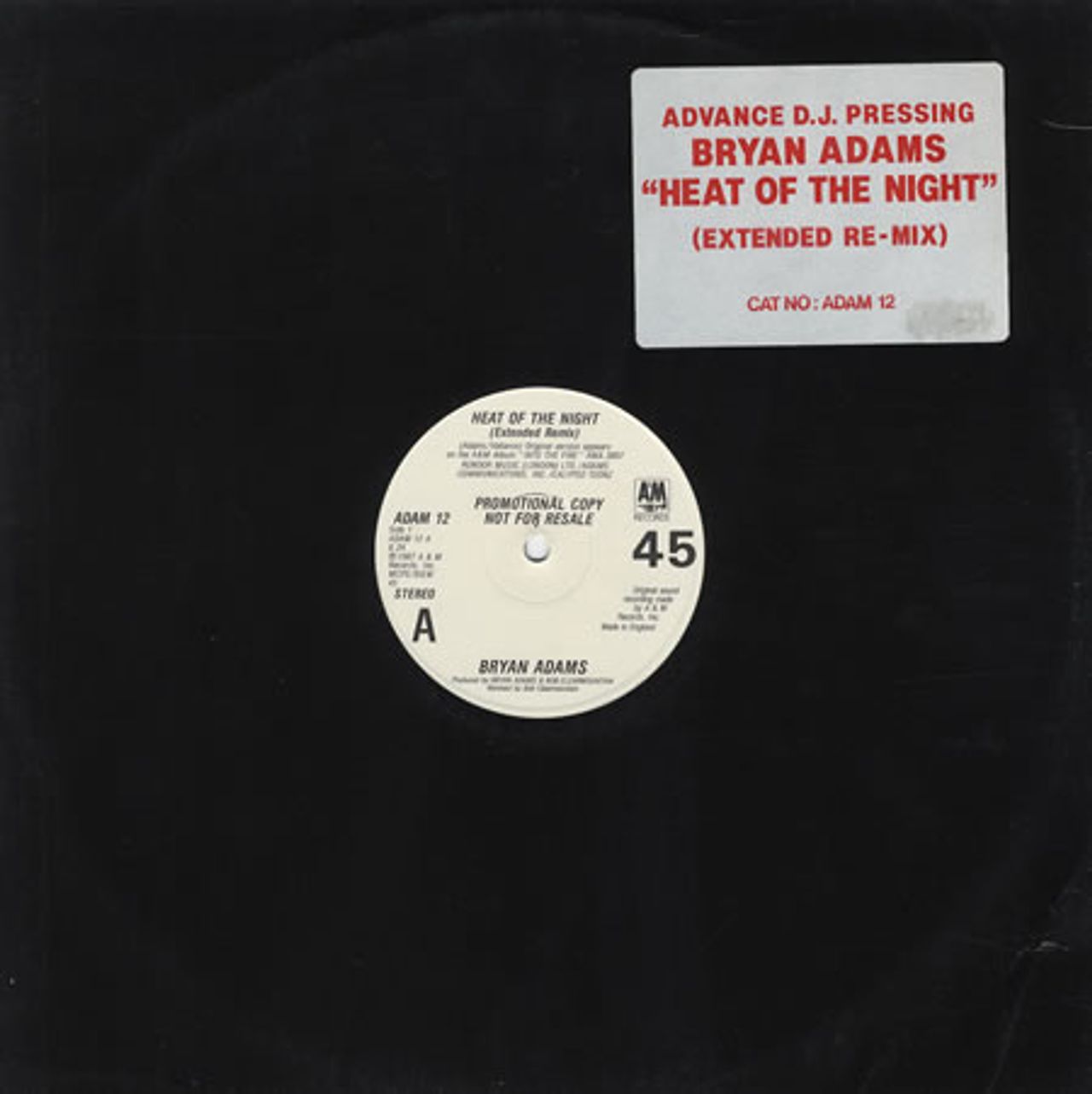 BRYAN ADAMS Heat Of The Night (1987 UK 3-track promotional 12" vinyl single including Bob Clearmountain's Extended Remix, Album Version and Another Day. Issued to DJs and radio in a red and white custom stickered sleeve ADAM12)