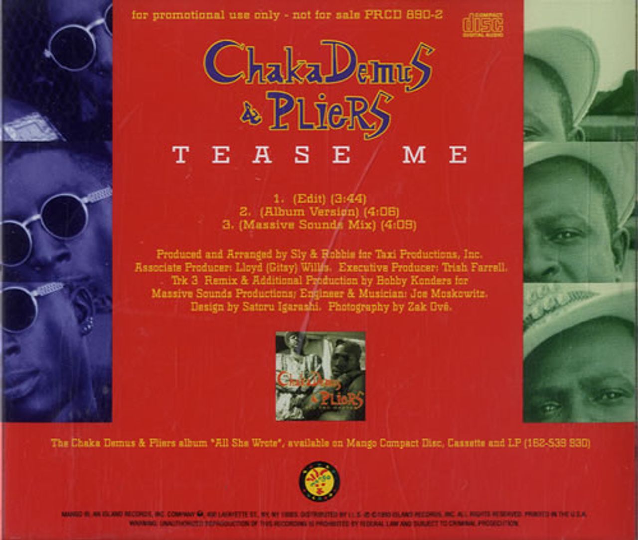 CHAKA DEMUS & PLIERS Tease Me (1993 US 3-track promotional CD featuring Edit, Album Version and Massive Sounds Mix, custom picture/tracklisting back insert PRCD890-2)