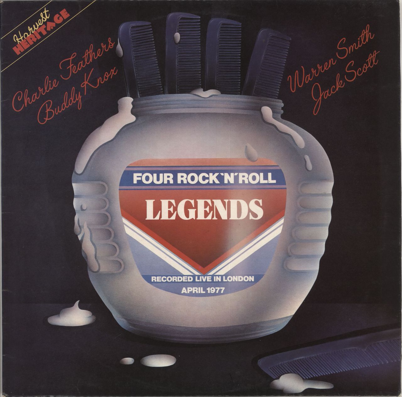 CHARLIE FEATHERS Four Rock 'N' Roll Legends (1978 UK 25-track LP, featuring Charlie Feathers, Buddy Knox, Warren Smith and Jack Scott recorded live and separately in London April '77, housed in a front laminated picture sleeve. The sleeve hassome light edge scuffing and ringwear, whilst the vinyl shows few signs of play SHSM2024)
