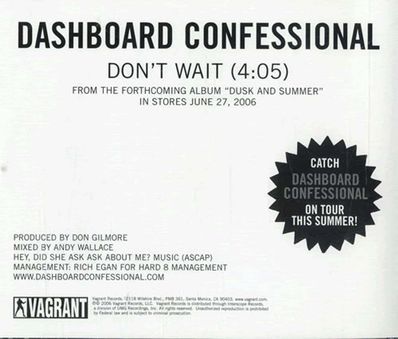 DASHBOARD CONFESSIONAL Don't Wait (2006 US promotional only