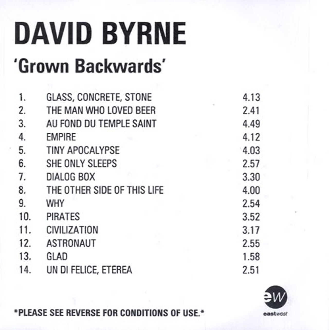 DAVID BYRNE Grown Backwards (Official 2004 UK EastWest 14-track promotional only CD-R for the full album featuring cover versions and opera arias. Custom printed disc with title/tracklisting insert)