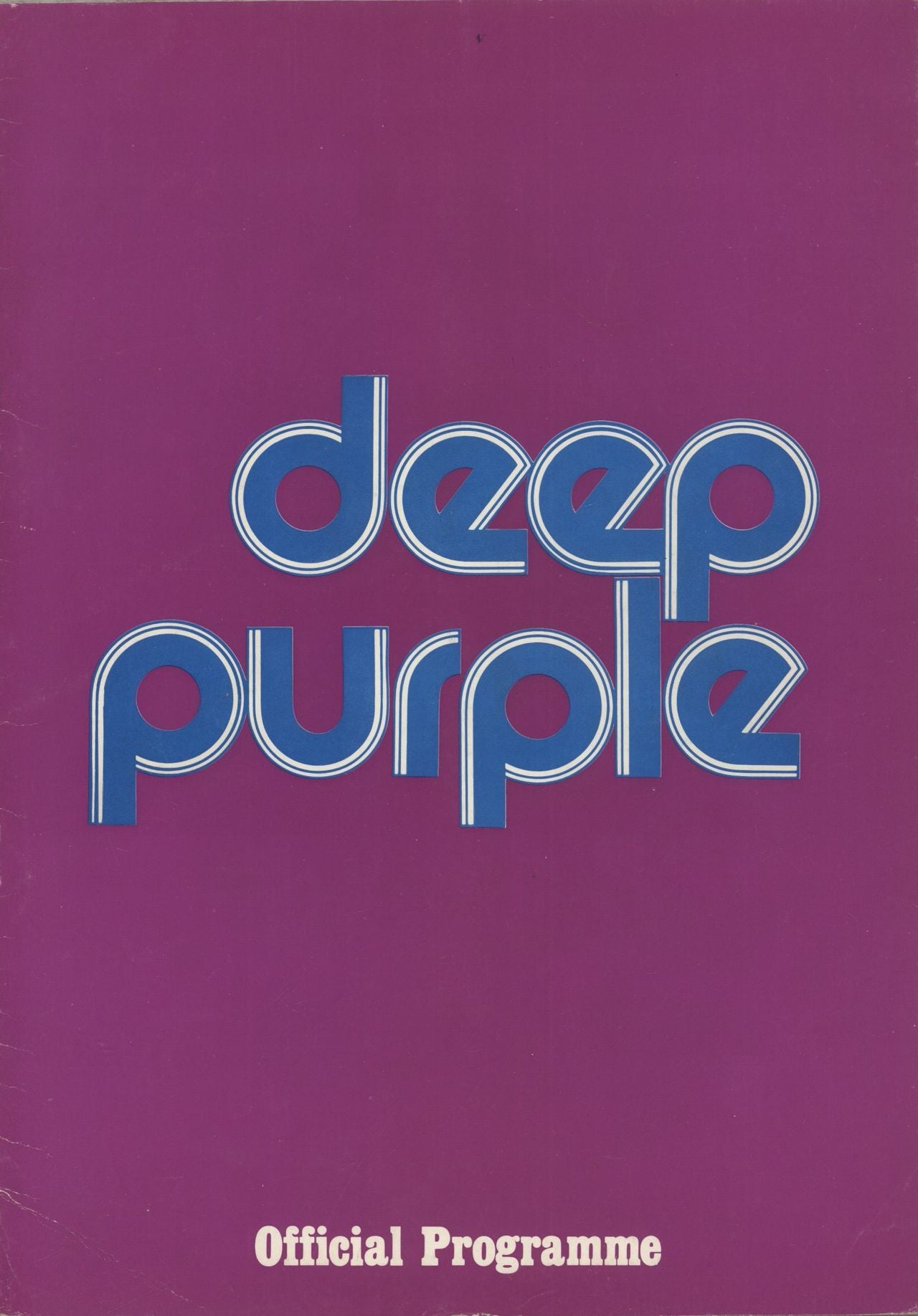 DEEP PURPLE USA Tour 1976 (Rare US 10-page tour programme, with black & white pages inside featuring a group biography and a page for each band member along with a group photo. All the text and images are different to that used on the UK programme for the same year. Along with a discography page at the back, with a two colour (purple & blue) card cover with white highlights and a plain white back. Printed in the UK by T W Pegg, Fulham, published by J K Smith, Heston, and sold on the US tour with excess stock later sold off at the UK shows the same year. The details for the merchandise inside is priced in US dollars but a with a UK address. Later copies, mostly the ones used in the UK has a page of new text pasted on that used for Glenn Hughes as he objected to the text on his page. This copy is in a really nice condition, considering it is almost fifty years old and made out of paper, the cover has some light general wear, more visible to the plain back cover, but has no rips or splits.A stunning item and the first we have ever seen!)