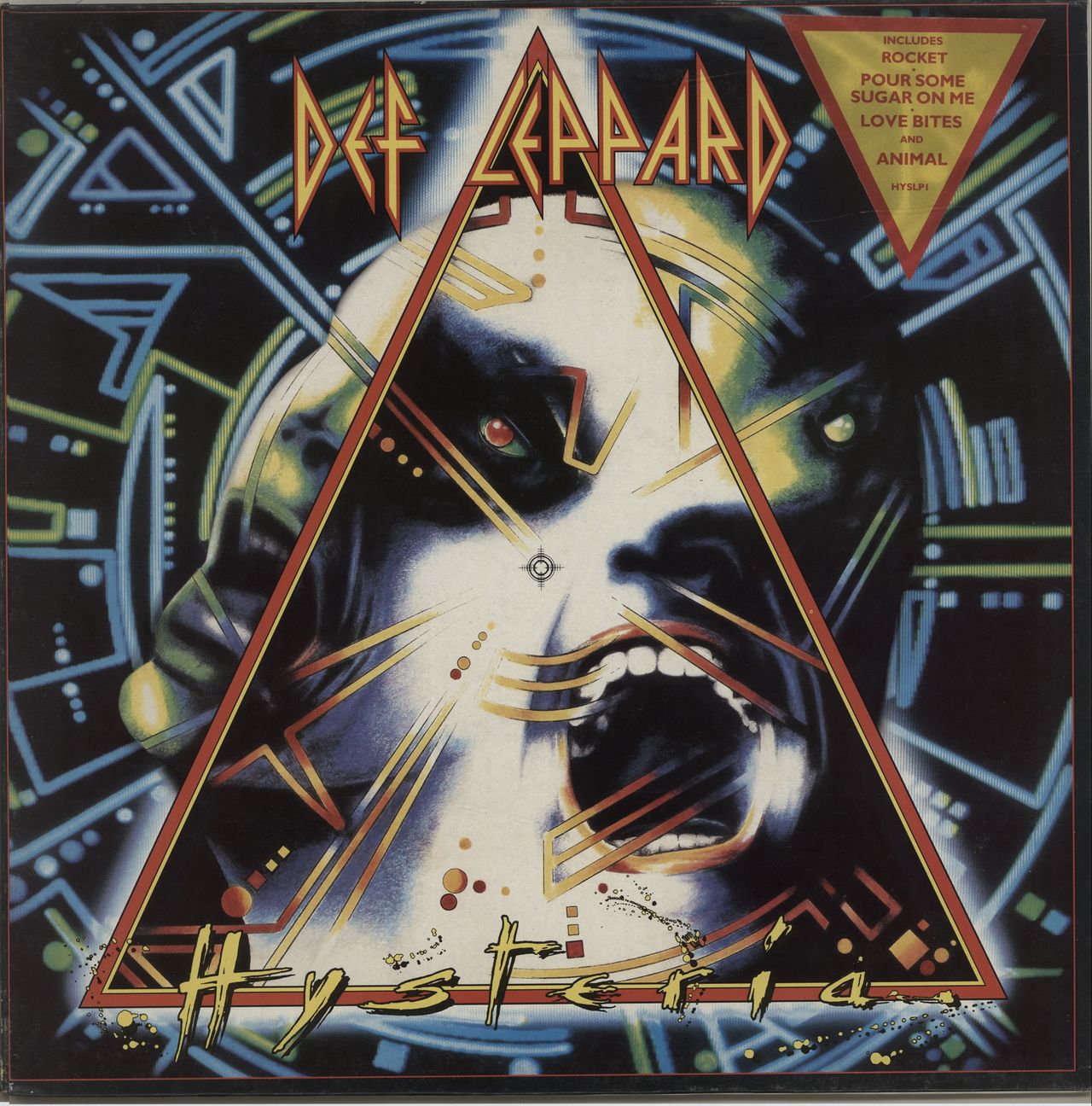 DEF LEPPARD Hysteria (1987 UK 12-track LP, the fourth album by the English rock band & their best-selling to date, including the classic singles Rocket, Pour Some Sugar On Me, Love Bites & Animal. Comes housed in the yellow triangular song-hype stickered picture sleeve complete with the illustrated inner & discography insert. The sleeve shows minimal wear & the vinyl carries mild paper scuffs which don't upset play - Recommended HYSLP1)