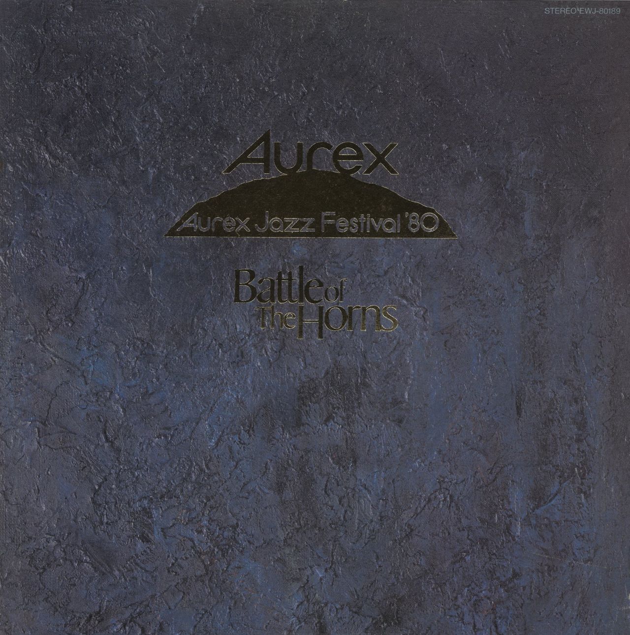 DIZZY GILLESPIE Battle Of The Horns (1980 Japanese 7-track vinyl LP, a fantastic set of tracks recorded at various venues during the 1980 Aurex Jazz Festival; venues include Budokan, Tokyo; Expo Park, Osaka and Yokohama Stadium, Yokohama. Features the blistering talents of Gillespie, alongside Illinois Jacquet, Eddie Davis, Harold Land, Cal Tjader, Cedar Walton, Eddie Gomez and Shelly Manne, complete with fold out Japanese insert, textured gold embossed picture sleeve. The sleeve shows some light edgewear and the vinyl remains in excellent condition with minimal play EWJ-80189)