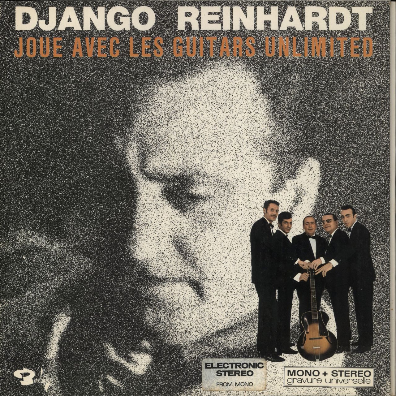DJANGO REINHARDT Joue Avec Les Guitars Unlimited (1968 French 10-track LP, housed in a superb front laminated gatefold picture sleeve with the period 'electronic stereo' sticker attached & extra side flap with the original languette index tagintact. The sleeve shows minimal wear & the vinyl still looks barely played)