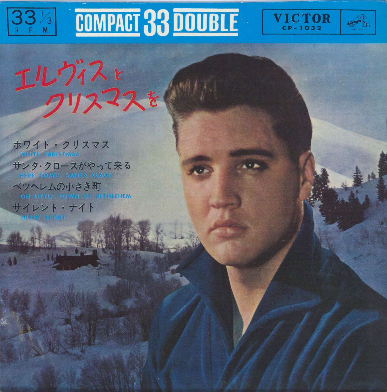 ELVIS PRESLEY Christmas With Elvis EP (Very rare Japanese 4-track solid centre 7" vinyl single, with HMV Victor 'Compact Double 33' series blue & silver labels, housed in a fully laminated picture sleeve with lyrics on reverse. The sleeve displays just a little light age wear with a small crease to the bottom left corner and light signs of the number '78' written on the back. The A-Side label has a small spot of paper loss, whilst the vinyl has a few light cosmetic surface scuffs not affecting play, overall a Very Good example CP-1032)