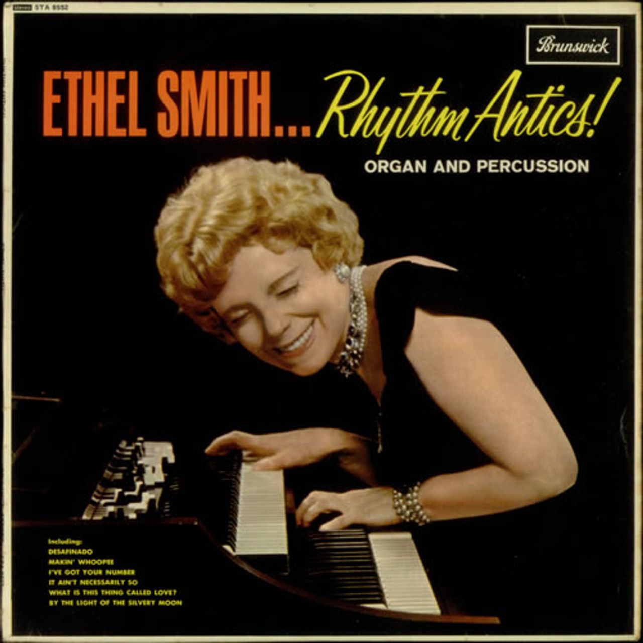 ETHEL SMITH Rhythm Antics! (1963 UK 12-track STEREO vinyl LP on the silver & purple 'deep groove' Brunswick label, front laminated flipback picture sleeve. The flimsy sleeve shows just a little shelfwear & the vinyl appears barely played leaving it Excellent - a nice copy! STA8552)