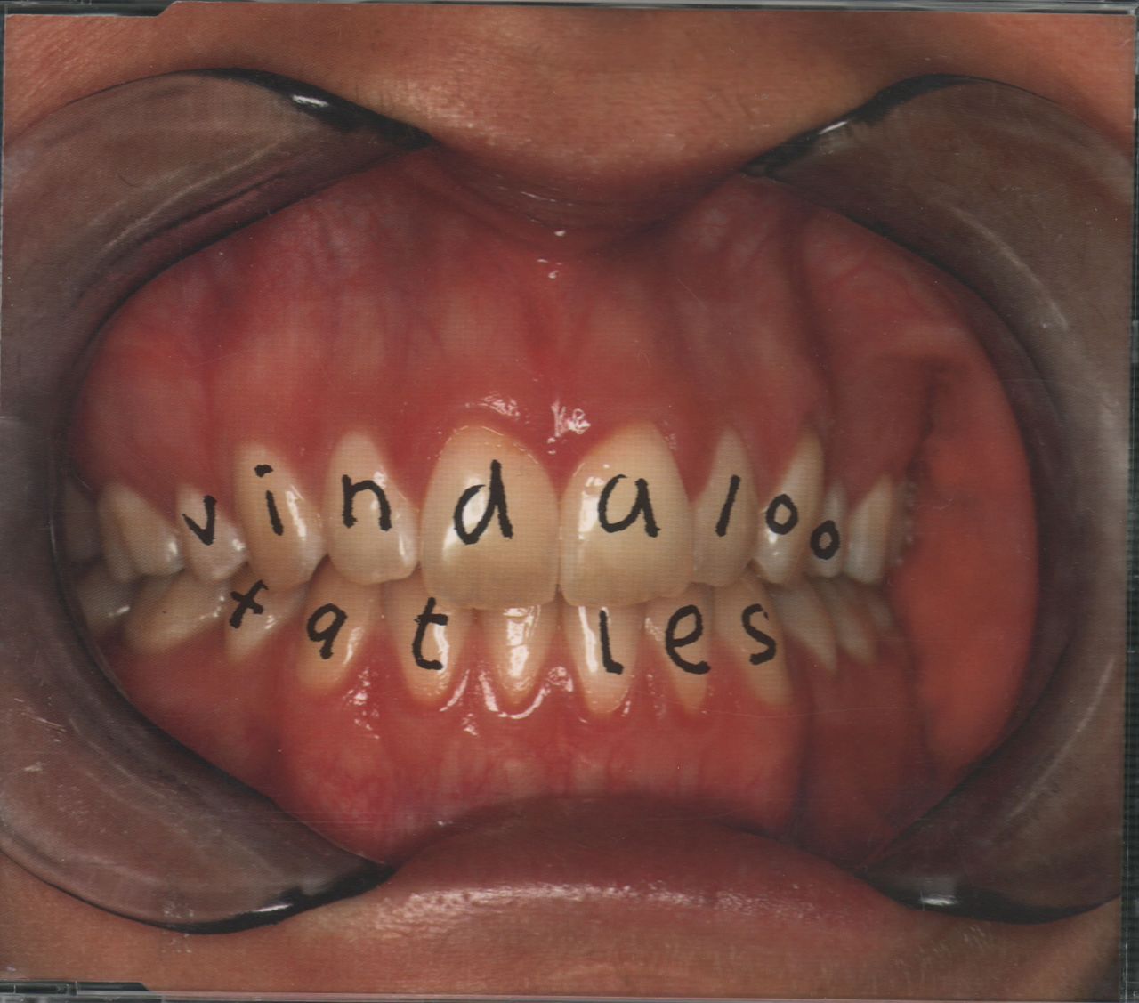 FAT LES Vindaloo (1998 UK 1-track promotional CD for the single which was written as a parody of football chants and recorded for the 1998 FIFA World Cup by the British trio consisting of Blur bassist Alex James, actor Keith Allen and artist Damien Hirst, including the Radio Edit. The custom printed disc comes issued in a slimline jewel case with the 'teeth' picture sleeve CDP2982)