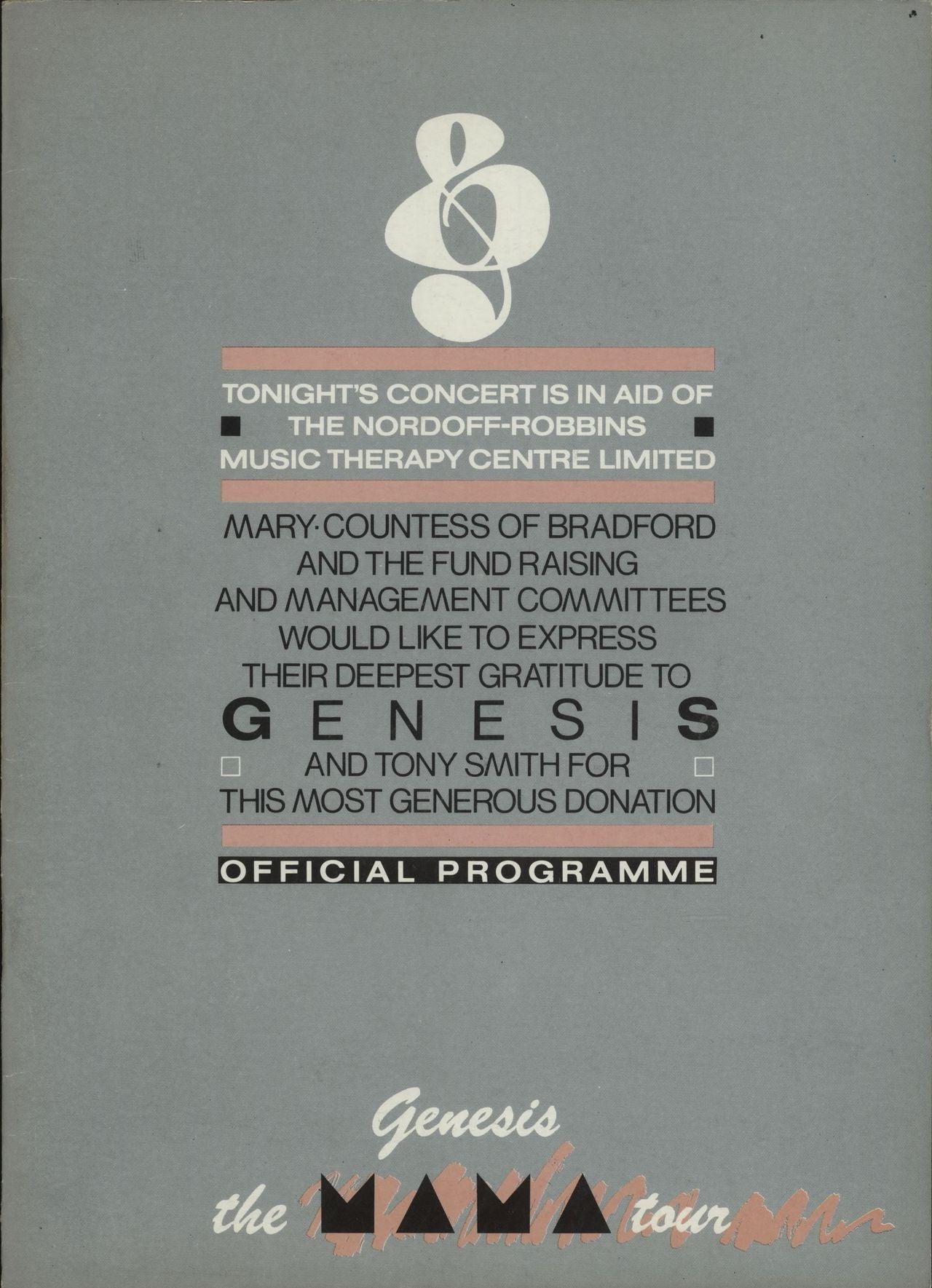 GENESIS The Mama Tour (1983 UK 36-page full colour official programme for the concert 'In Aid Of The Nordoff-Robbins Music Therapy Centre Limited with a message 'Mary Countess of Bradford and The Fund Raising and Management Committees would like to express their deepest gratitude to Genesis and Tony Smith for this most generous donation' on the front and information regarding music therapy on the inside front & back cover, plus exciting exciting photographs of the band in sports gear throughout!)
