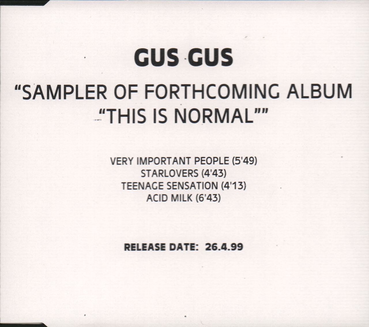 GUS GUS This Is Normal Sampler (1999 UK Masterpiece 4-track promotional only CD-R features Very Important People, Starlovers, Teenage Sensation and Acid Milk. Issued to radio only, custom printed disc and title insert)