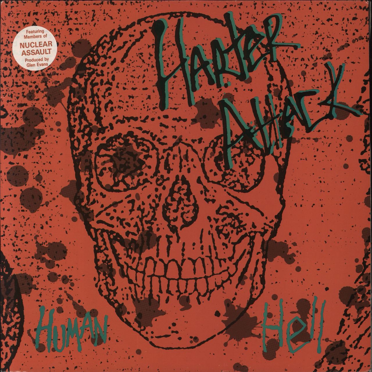 HARTER ATTACK Human Hell (1989 French 10-track LP on the Metalcore label, the debut and only album from the harcore thrash group featuring members of Nuclear Assault. Housed in a hype-stickered picture sleeve with a textured lyric printed inner. The sleeve displays minimal wear and the vinyl looks barely played CORE1)