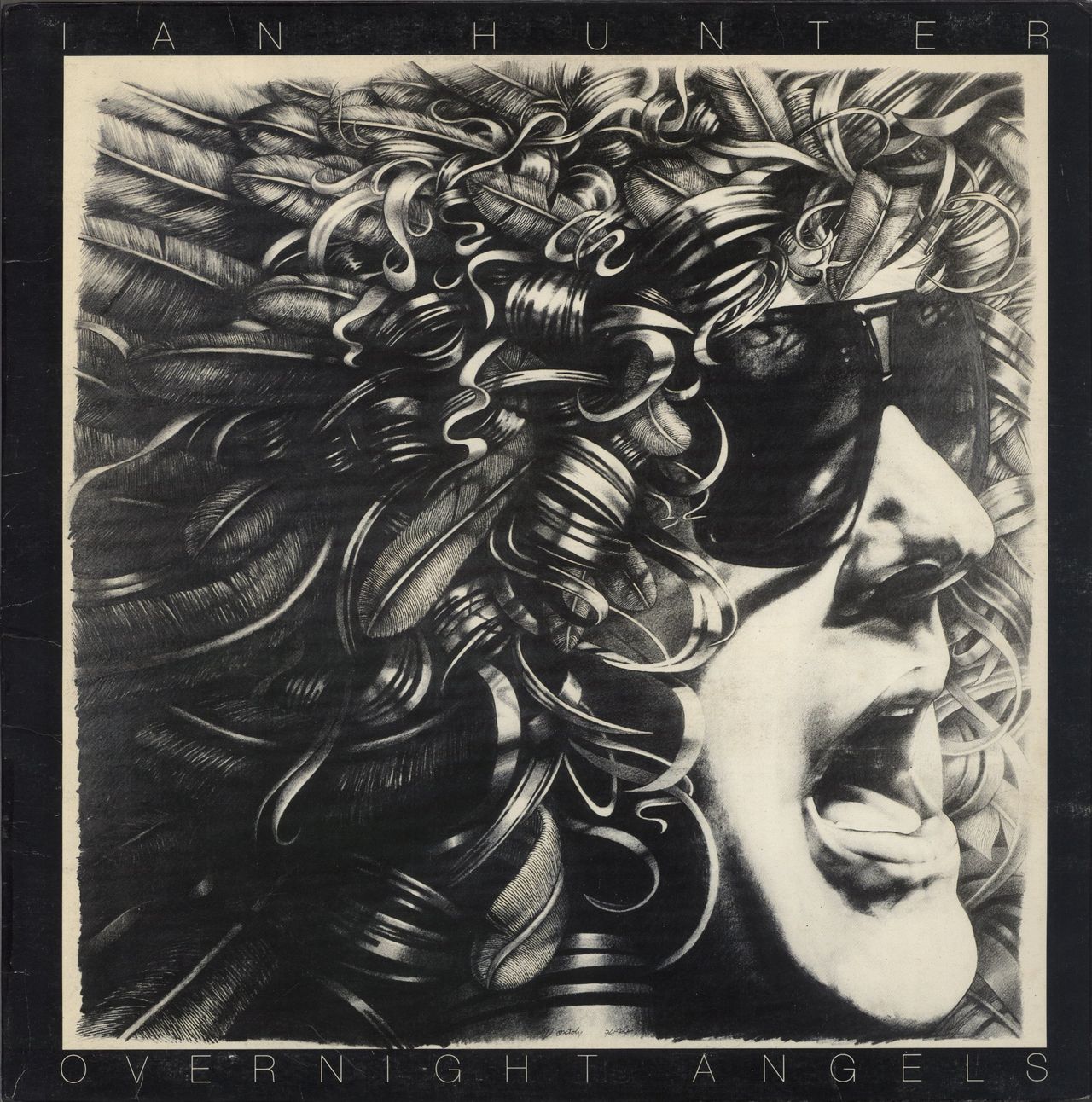 IAN HUNTER Overnight Angels (1977 UK 9-track vinyl LP, the Roy Thomas Baker produced album which saw Ian up-the-pace from his previous release, gatefold picture sleeve. The sleeve shows light wear with some dents/scrapes to the reverse, whilstthe vinyl is Excellent with little sign of play)