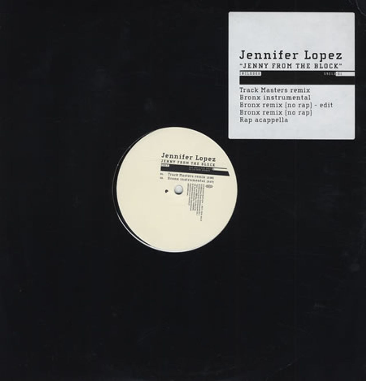 JENNIFER LOPEZ Jenny from The Block (2002 US 5-mix promotional vinyl 12" for the single release, featuring the Track Masters Remix, Bronx Instrumental, Bronx Remix (No Rap) Edit, Bronx Remix (No Rap) and Rap Acappella versions of the title track, custom stickered die cut sleeve)