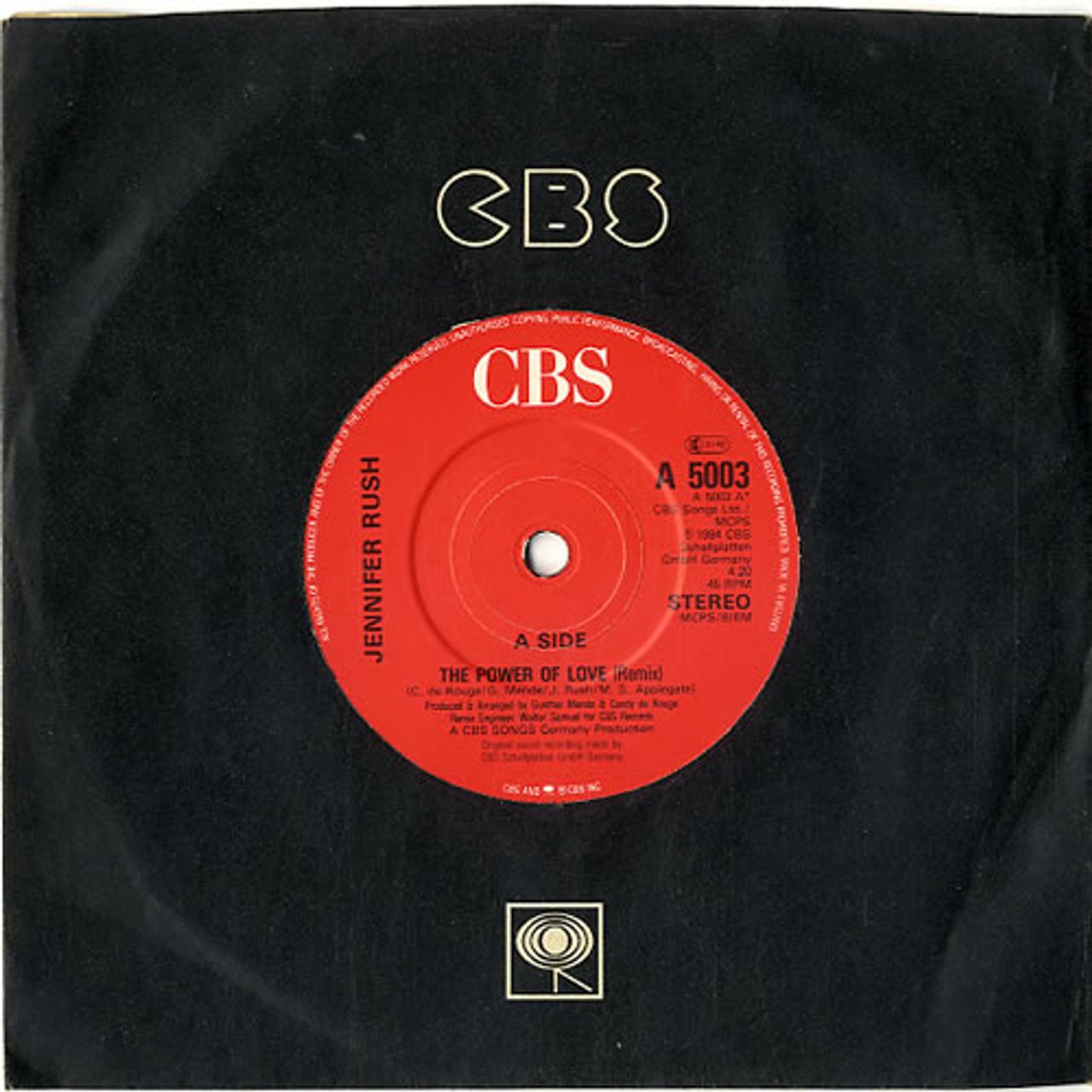 JENNIFER RUSH The Power Of Love (1985 UK solid centre 7" vinyl single featuring the Remix Version of her classic 80s hit plus I See A Shadow. Issued in a CBS company die-cut paper sleeve, the vinyl remains in excellent condition A5003)
