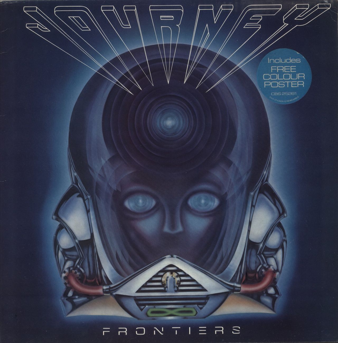 JOURNEY Frontiers (1983 UK 10-track vinyl LP with picture labels, includng Separate Ways [Worlds Apart], Send Her My Love, Chain Reaction, After The Fall and Faithfully, glossy picture sleeve & lyric inner. The sleeve, which carries the original hype sticker, shows only minor edgewear and the vinyl looks barely played CBS25261)
