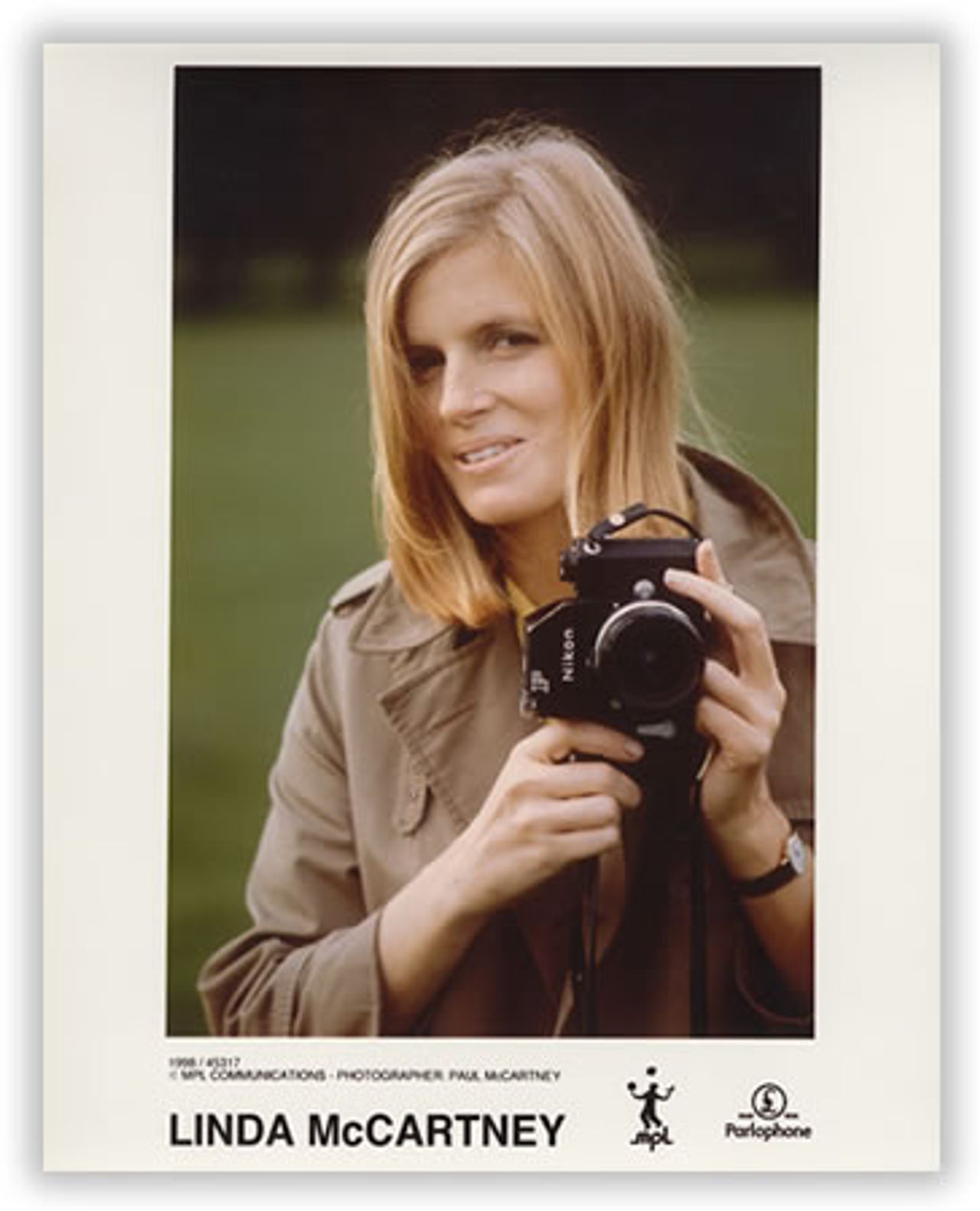 LINDA MCCARTNEY Portrait by Paul McCartney (UK original 10" x 8" glossy colour publicity photograph machine-printed on Kodak Professional paper, issued as part of the publicity and promotional campaign for Linda's Wide Prairie album. This image was actually taken by Paul, and shows Linda holding her famous Nikon F SLR camera. Dated 1998)* Please note - this is an ORIGINAL publicity still distributed by the press office. It is not a copy. Copyright remains with MPL and must not be reproduced without their written permission *
