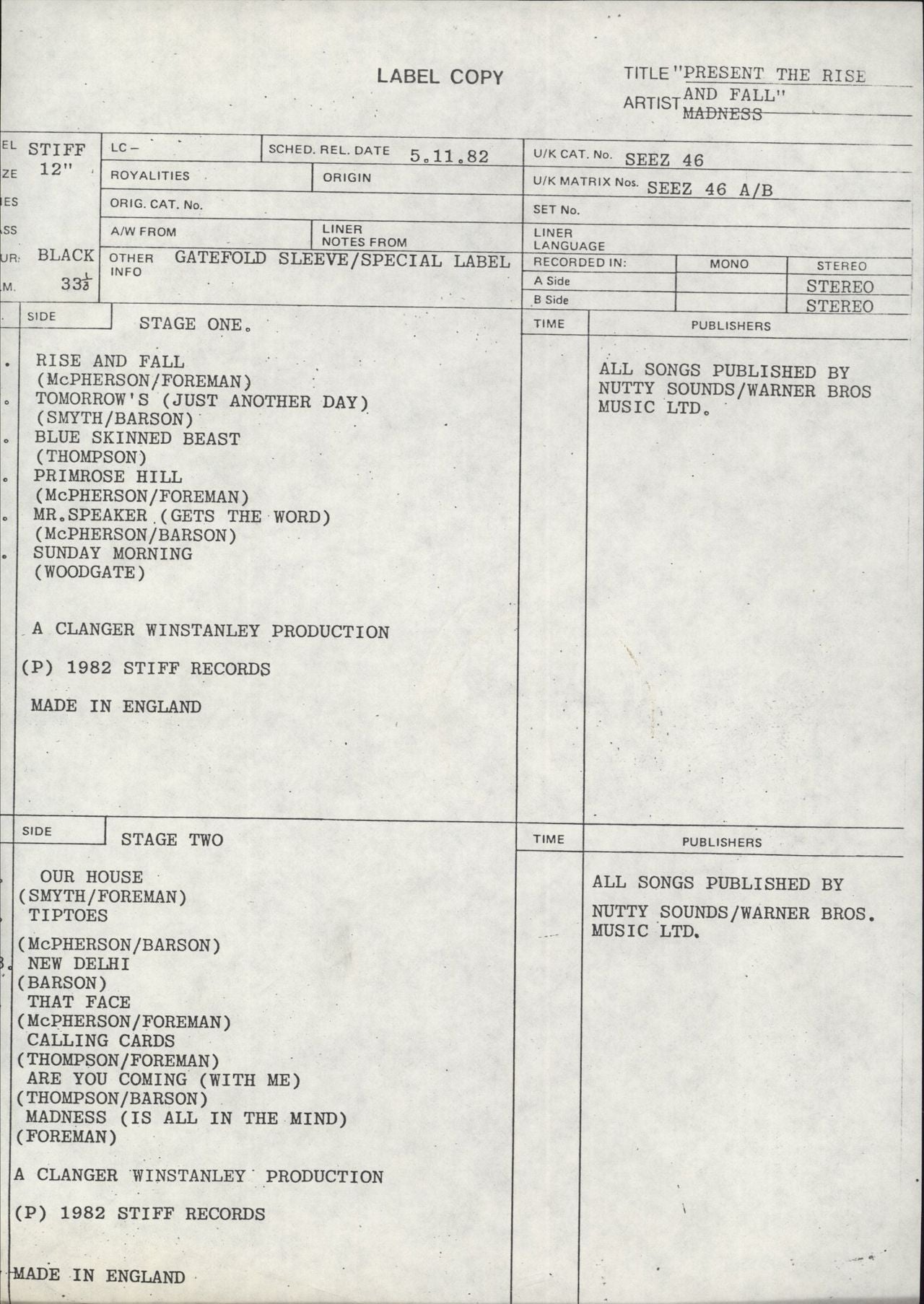 MADNESS The Rise & Fall (Rare 1982 UK 13-track white label vinyl LP test pressing for the full album, with SEEZ-46-A1 / B1 scratched matrices along with 'ARUN'. Including the singles Our House & Tomorrow's Just Another Day. This example has plain white labels in a plain card sleeve, with the original record company copy sheet, with tracklisting, release date, publishers details and more. Obtained from a former Stiff Records employee, the vinyl remains in a stunning conditon with little to no signs of play)