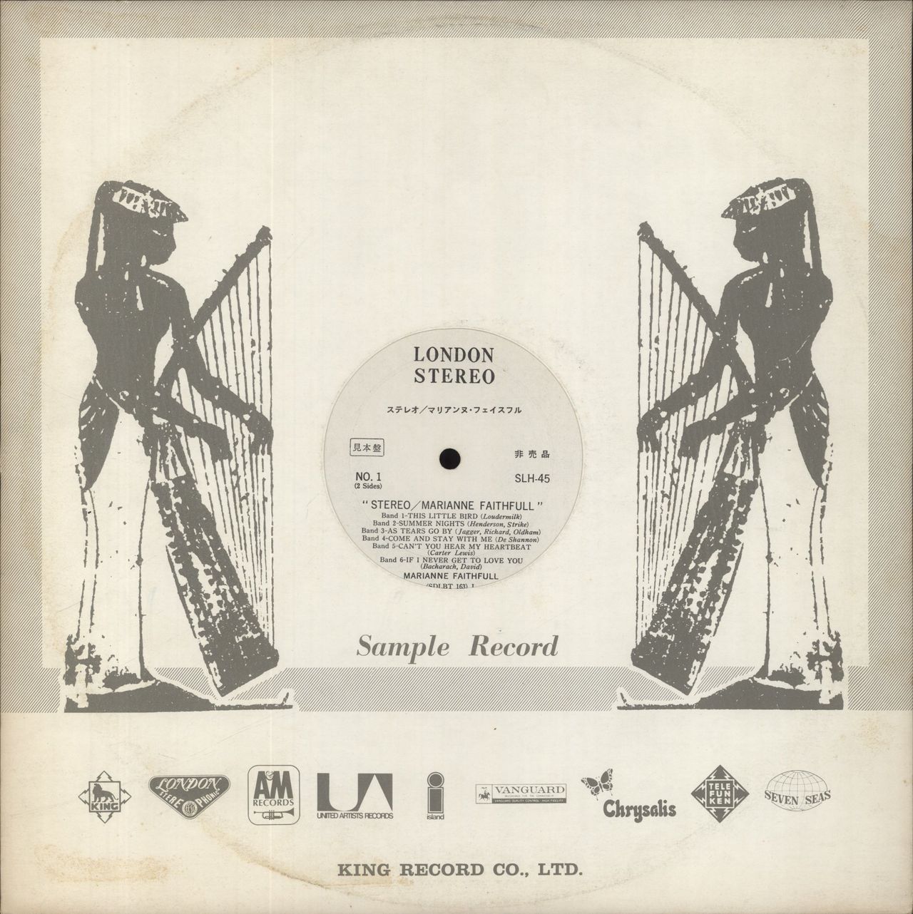 MARIANNE FAITHFULL Stereo / Marianne Faithfull (Rare 1966 Japanese 12-track advance promotional LP with custom black on white London labels with a deep groove, and actually has the title of the record as Stereo. The third edition of Marianne's self-titled album, released only in Japan, the final track listing contains only five songs of the original version with songs originally from the 'Come My Way' UK LP, except for track Down Town, and includes the hit-singles 'This Little Bird' and 'Summer Nights', with the tracks also in a significantly different order. Housed in a 'Sample Record' die-cut King Record company card sleeve with various record company logos. The vinyl is in Excellent condition with only a few light signs of play. A nice example of this rare pressing, and the first we have ever seen SLH-45)