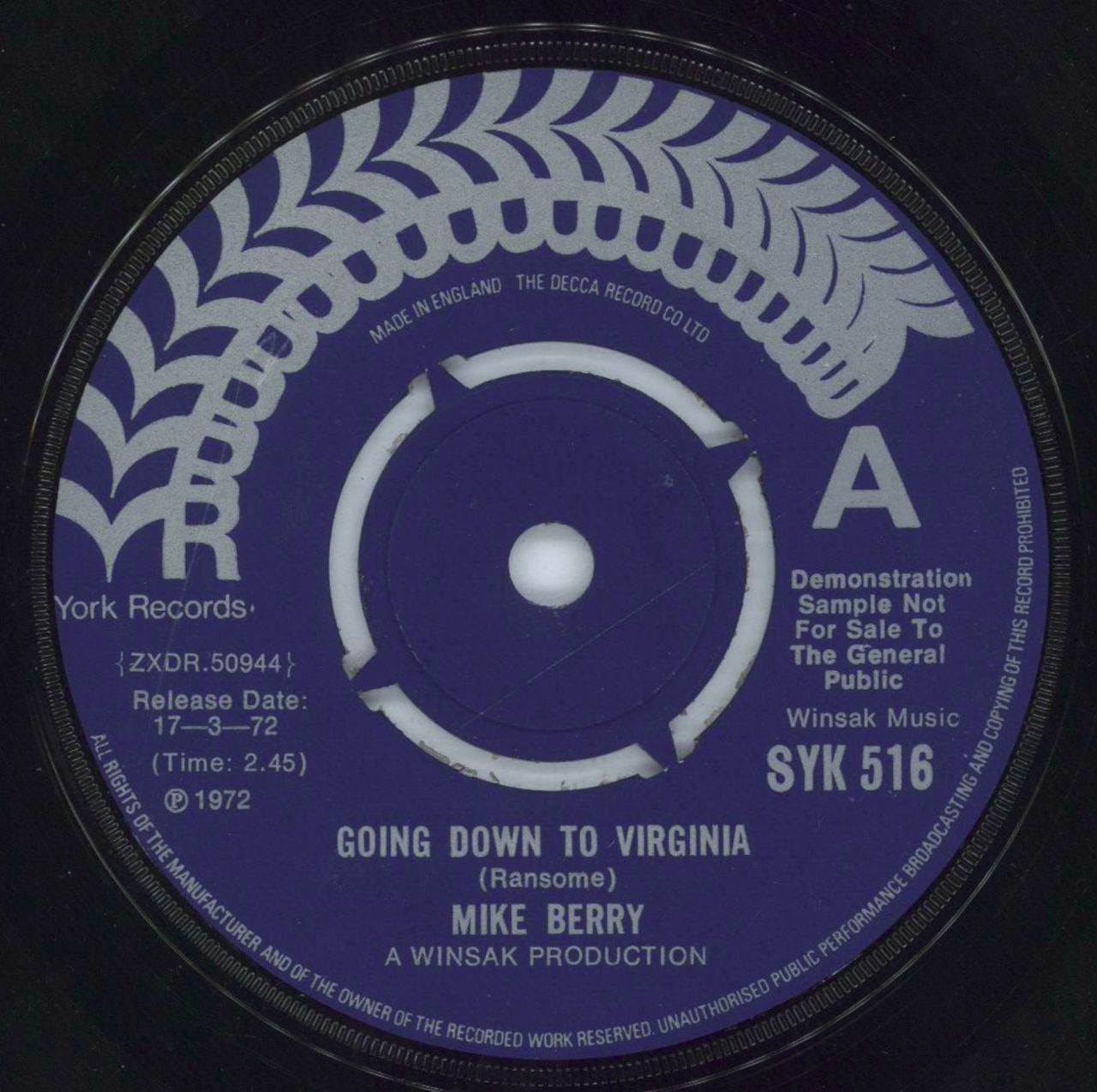 MIKE BERRY Going Down To Virginia (1972 UK 'A' label