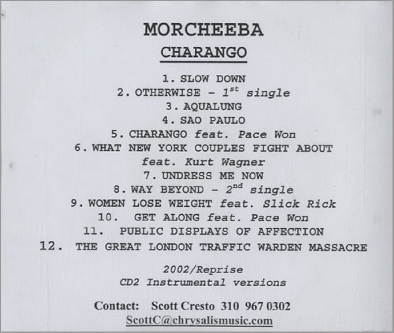 MORCHEEBA Charango (Official 2002 US Chrysalis Music Group USA label promotional double CD-R acetate set. Comprising of the 12-track album plus bonus disc which is the album performed purely instrumentally, in it's entirety. Both discs are custom printed and are presented with a custom printed rear insert, with full tracklisting)