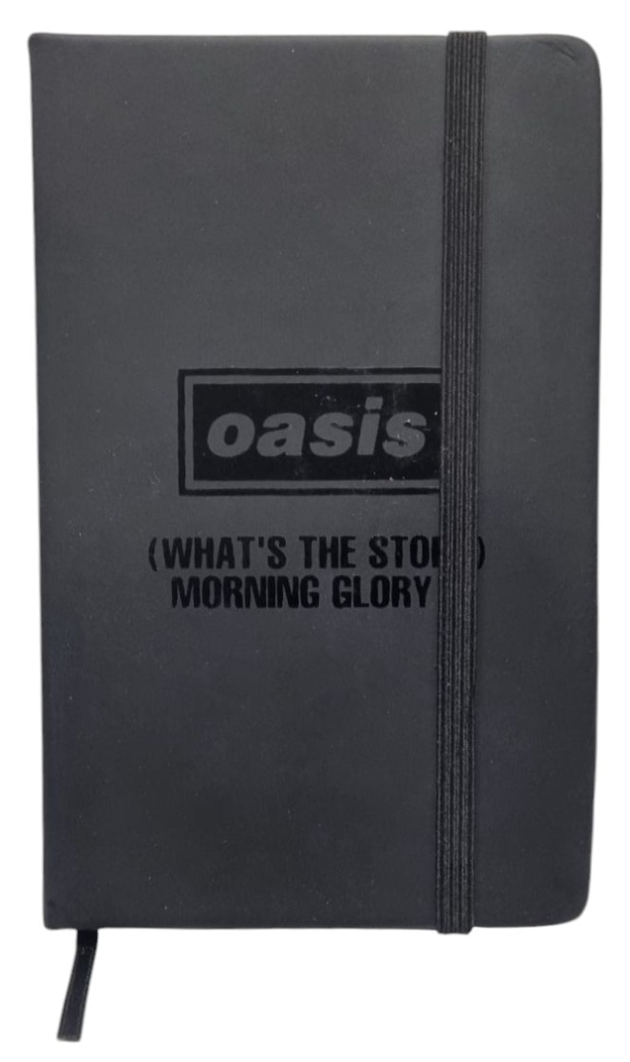OASIS (What's The Story) Morning Glory? (Circa 2014 UK promotional only notebook with plain pages, custom black matt finish cardboard bound cover with rounded corners for a finished look, printed with glossy artist name logo & albumtitle on the front, with an integrated thin ribbon page bookmark and elasticated closure which helps keep notebook securely closed. This was part of a promotional campaign entitled 'Chasing The Sun', to help promote the remastered and re-released album in September 2014)