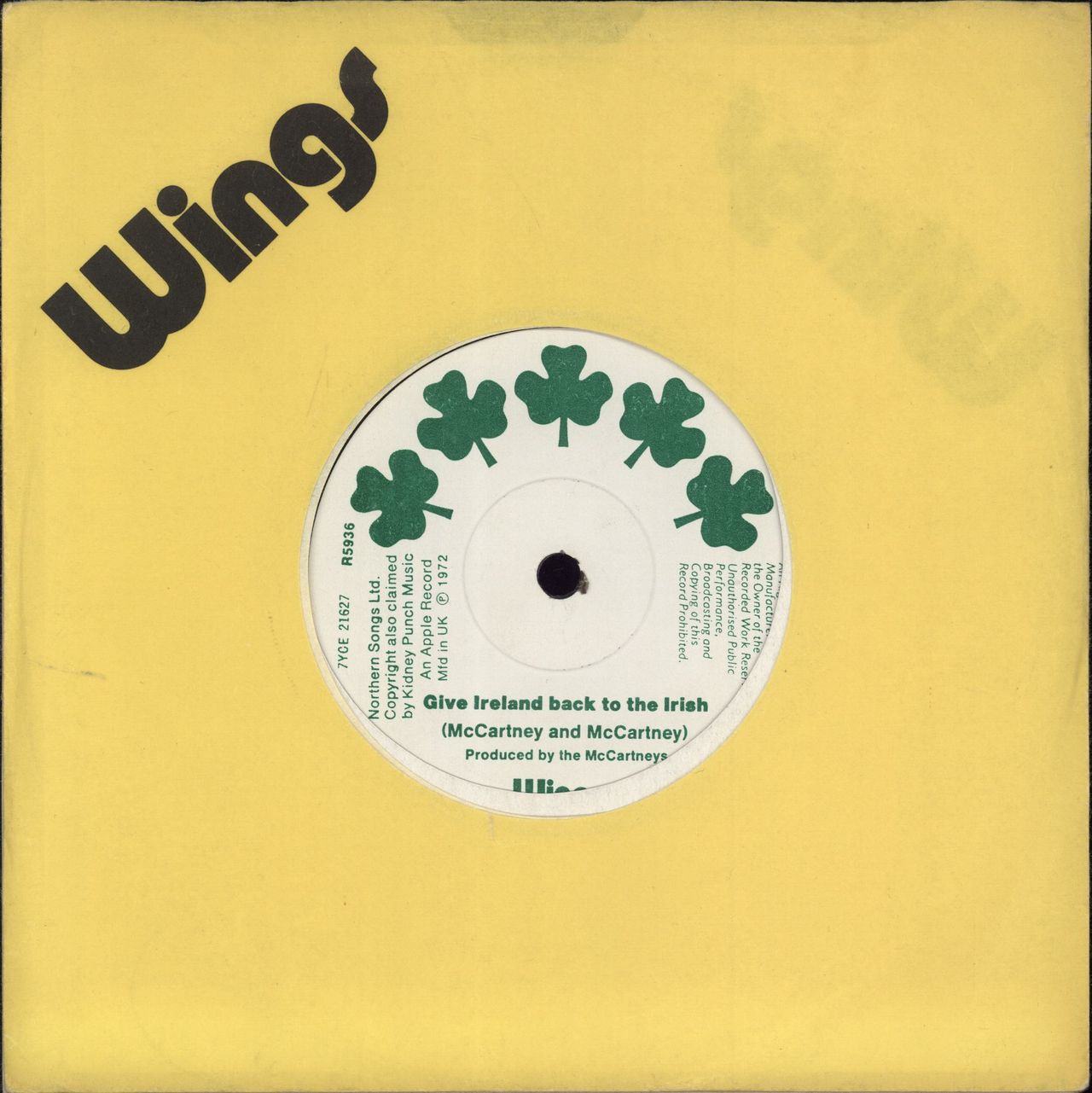WINGS Give Ireland Back To The Irish (1972 UK solid centre 7" vinyl single, also featuring the Instrumental Version, 'Wings' printed yellow die cut paper sleeve. The vinyl remains excellent with only a few light signs of play R5936)